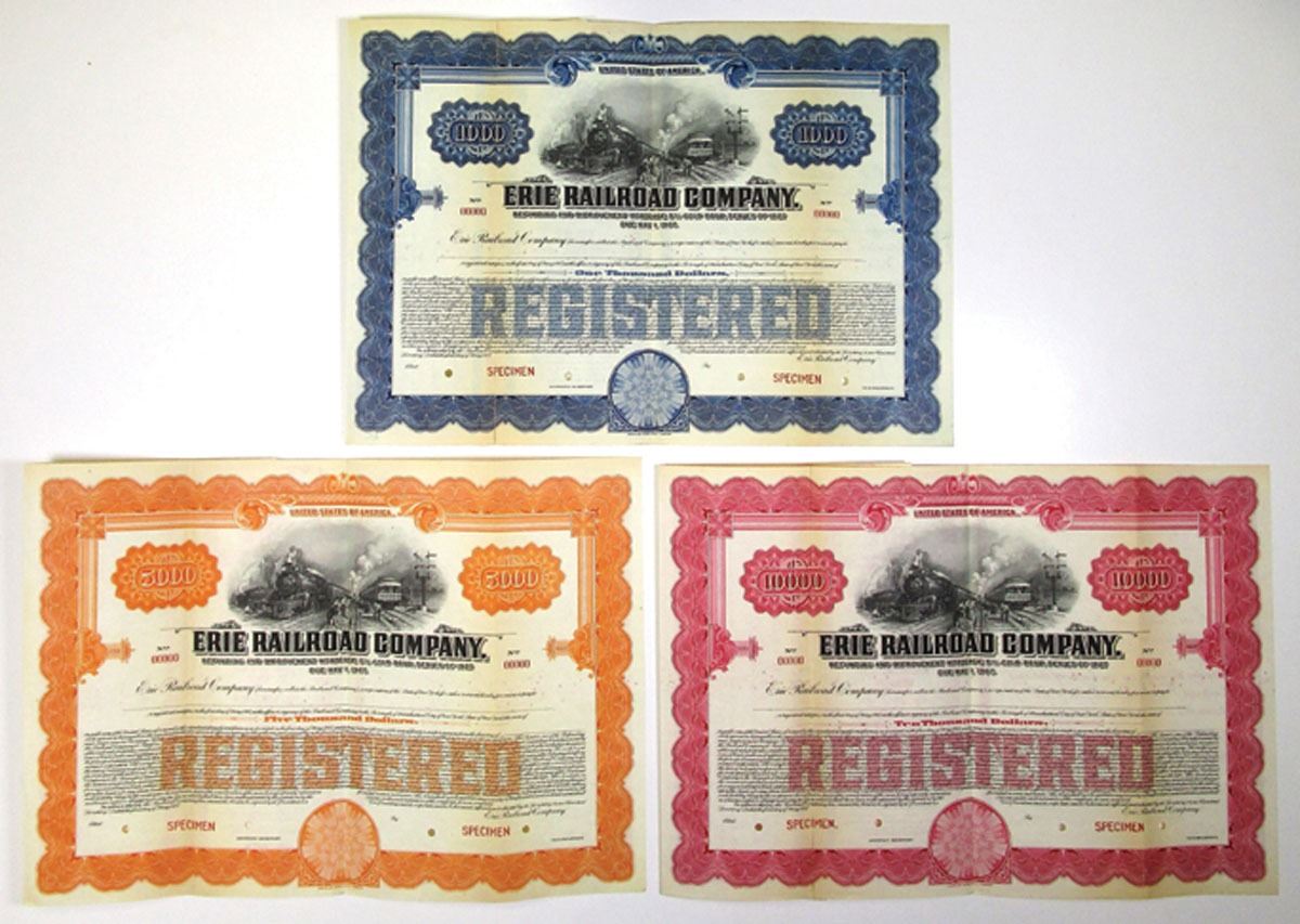 New York, 1927, Lot of 3 Specimen Bonds, Includes: $1000 Registered 5% Refunding and Improvement Mortgage Gold Bond, Black with blue border; $5000 Registered 5% Refunding and Improvement Mortgage Gold Bond, Black with orange border; $10,000 Registered 5% Refunding and Improvement Mortgage Gold Bond, Black with red border. All have vignette of men working between two oncoming trains, Specimen overprints and POCs, are in VF to XF condition with archival reinforcements, printed by ABNC. (3). Sold "AS IS" no returns accepted.