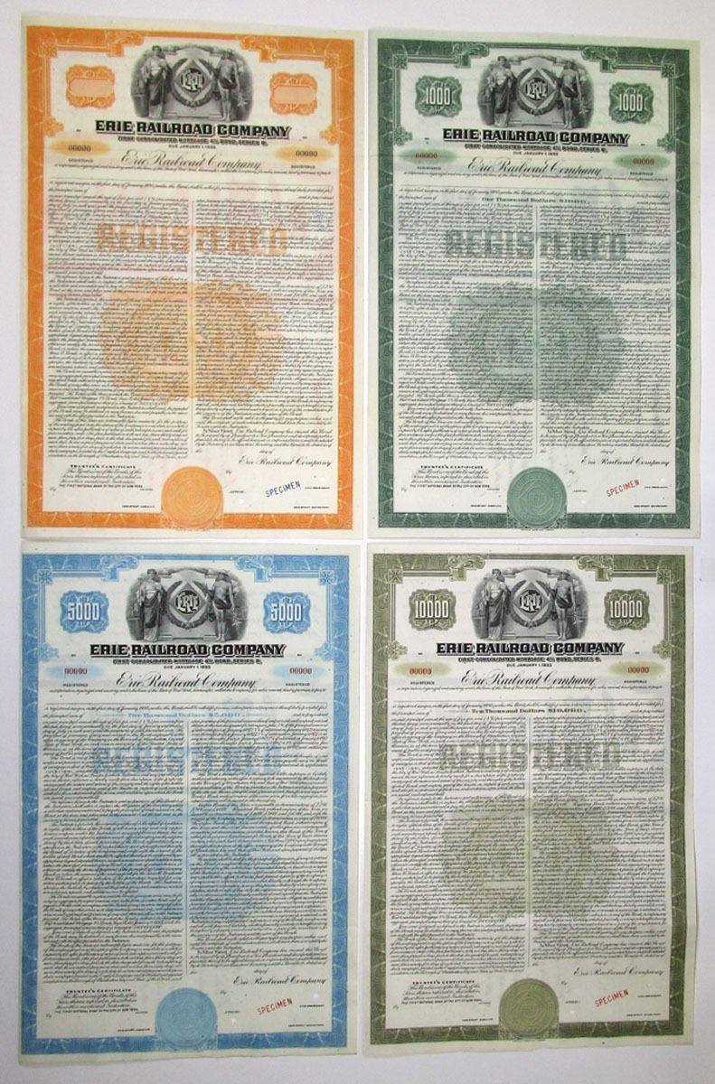 New York, 1941, Lot of 4 Specimen Bonds, Includes: $-Odd Registered 4 1/2% Series B First Consolidated Mortgage Bond, Black with orange border; $1000 Registered 4 1/2% Series B First Consolidated Mortgage Bond, Black with green border; $5000 Registered 4 1/2% Series B First Consolidated Mortgage Bond, Black with blue border; $10,000 Registered 4 1/2% Series B First Consolidated Mortgage Bond, Black with olive green border. All have Specimen overprints, POCs, are in XF to AU condition, printed by ABNC. (4). Sold "AS IS" no returns accepted.