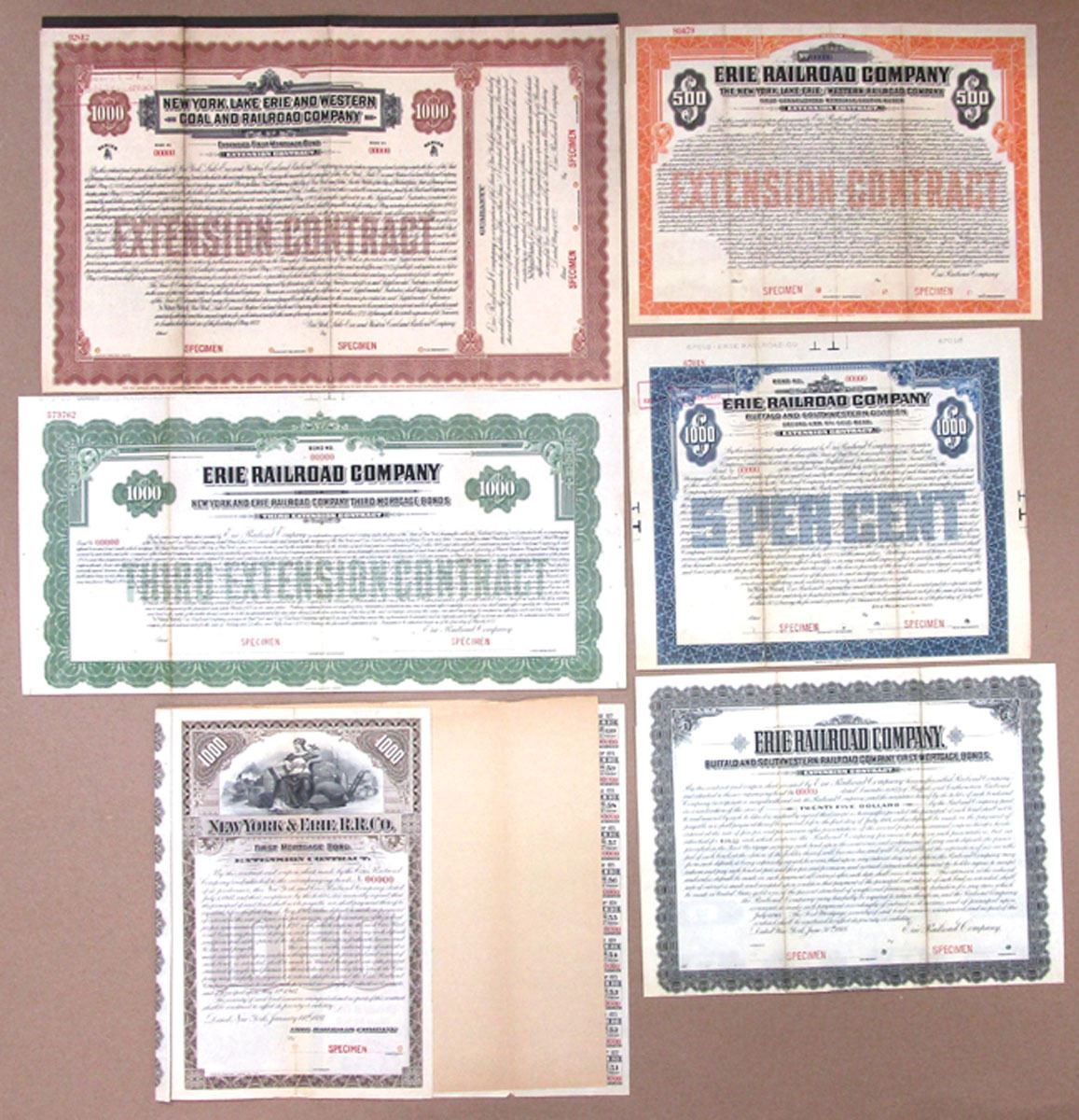 New York, 1897 to 1933. Lot of 6 Specimen Bonds, includes: 1897 New York & Erie Railroad Co. $1000 4% Coupon Bond; 1908 Erie Railroad Co., Buffalo and Southwestern Railroad Co. $25 5% Extension Contract Coupon Bond; 1918 Erie Railroad Co., Buffalo and Southwestern Division $1000 5% Extension Contract Second Lien Gold Coupon Bond; 1920 Erie Railroad Co., New York, Lake Erie and Western Railroad Co. $500 7% Extension Contract First Consolidated Mortgage Coupon Bond; 1922 New York, Lake Erie and Western Coal and Railroad Co. $1000 5.5% Extension Contract First Mortgage Coupon Bond; and 1933 Erie Railroad Co. $1000 4.5% Third Extension Contract Coupon Bond. All have specimen overprints, 00000 S/Ns, and POCs. Condition ranges from Fine condition to VF, Some with splits along fold lines. (6). Sold "AS IS" No returns accepted.
