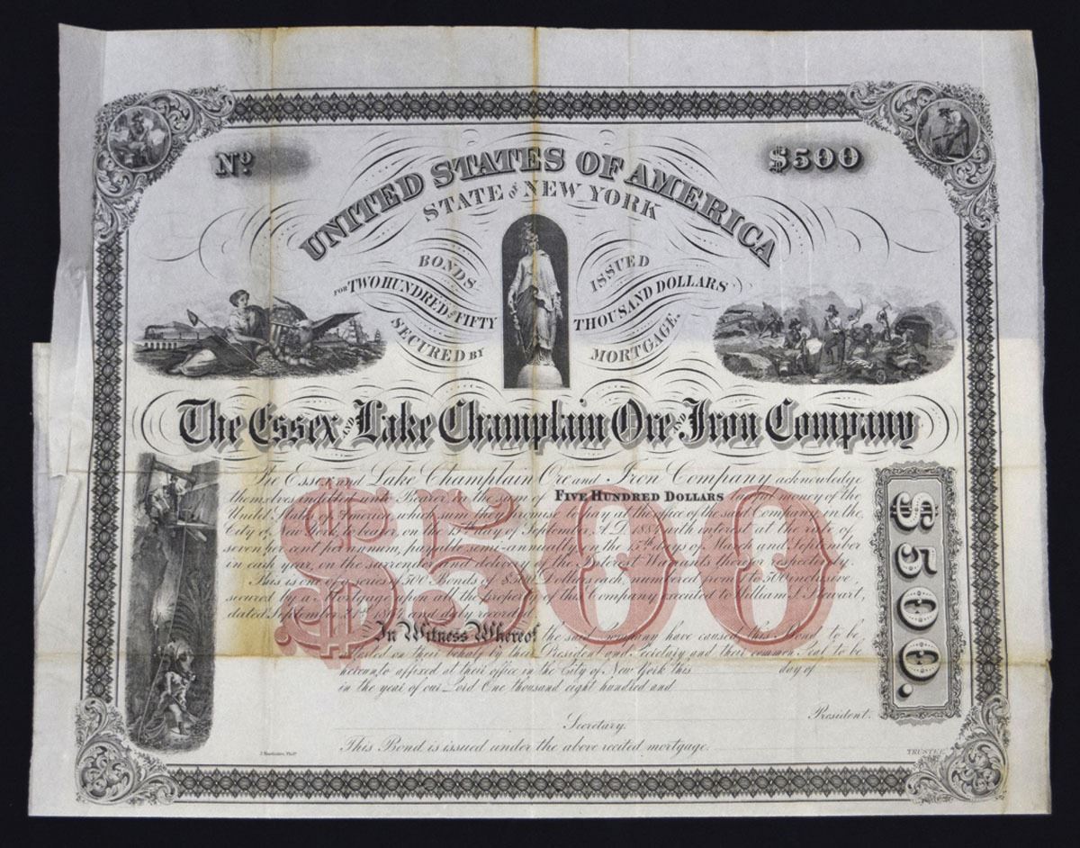 New York, ND (ca. 1865-1870). $500 U/U 7% Coupon Bond, Black print with black border and red underprint, Large vignettes at top with company title at center and mining vignette running down length at left, VF to VF+ condition with toning at fold lines and minor splits at fold lines.