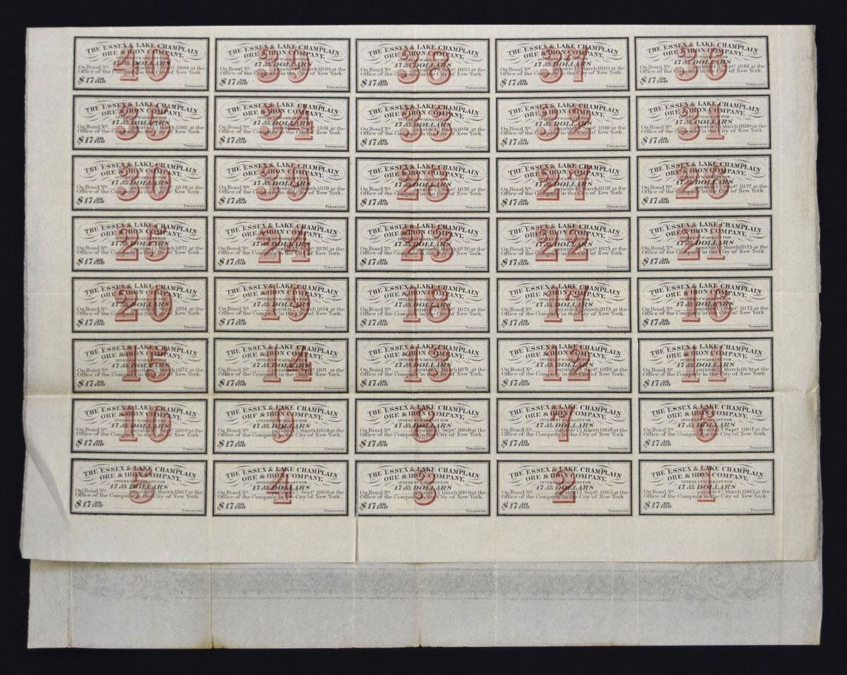 New York, ND (ca. 1865-1870). $500 U/U 7% Coupon Bond, Black print with black border and red underprint, Large vignettes at top with company title at center and mining vignette running down length at left, VF to VF+ condition with toning at fold lines and minor splits at fold lines.