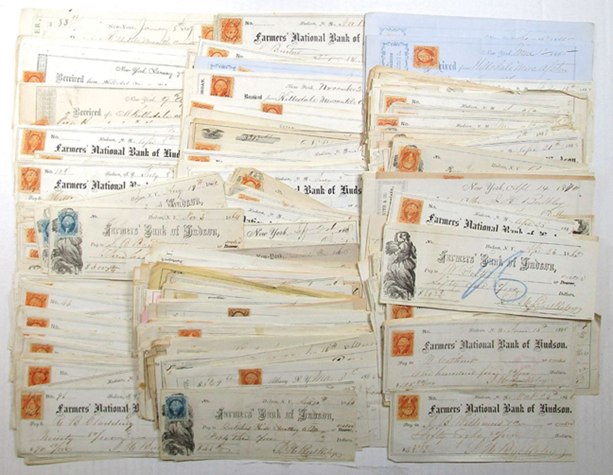 New York, and a few other states, mainly Hudson, NY. Lot of 400+, I/C Bank Checks, Fine to XF condition. Mostly Farmers Bank of Hudson with a few other banks, Checks have adhesive revenue stamp. All unsearched for revenues, autographs and usages, From an old collection. (400+). Sold "AS IS" no returns accepted.