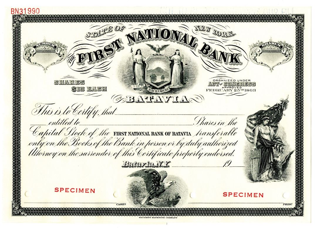 Batavia, NY. First National Bank of Batavia. ca.1900,ÊOdd Shrs Stock Certificate Specimen, Uncirculated, SBNC
