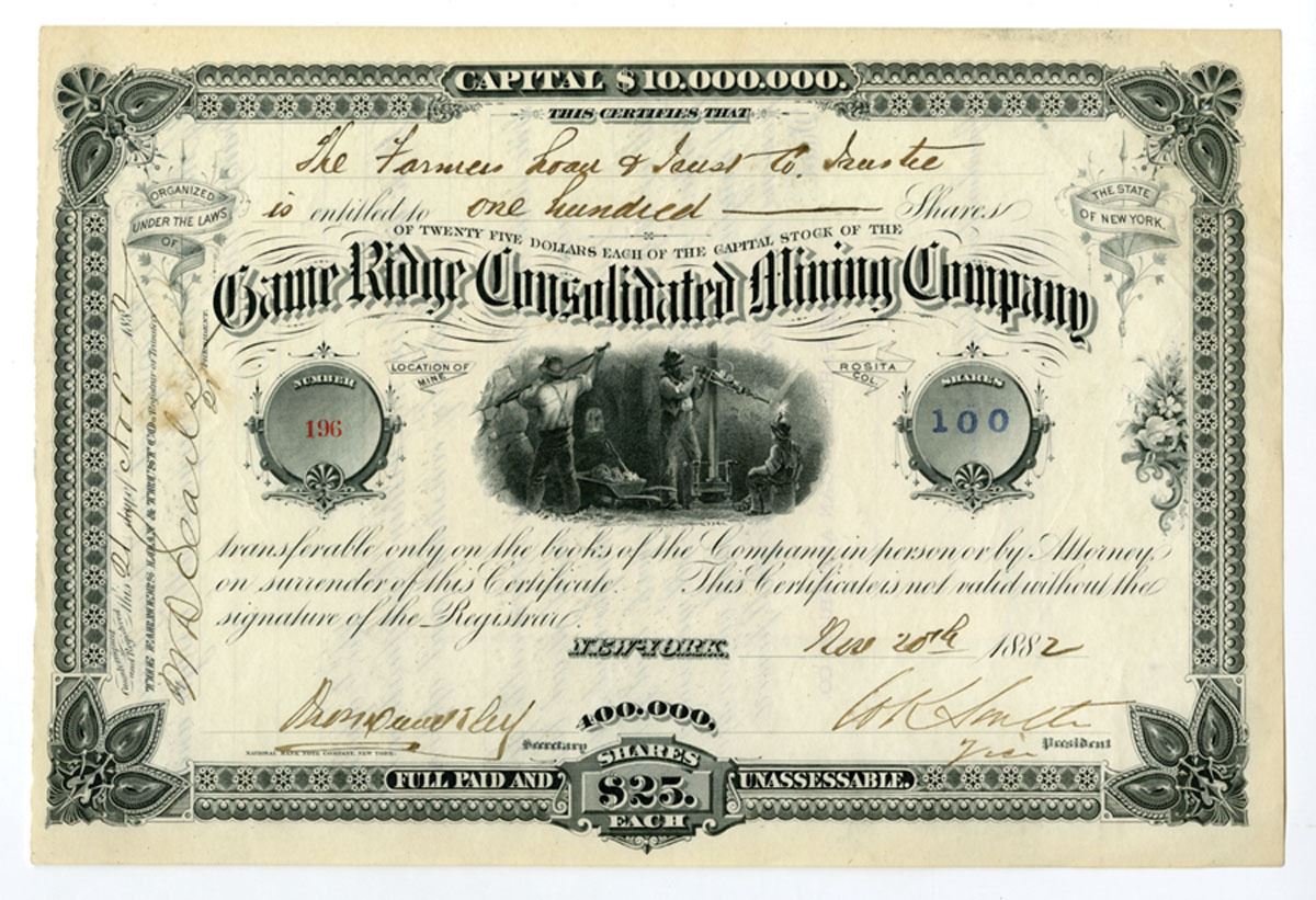 New York, 1882. 100 Shares I/U Capital Stock Certificate, Black print with black border and mining vignette under title, S/N 196, VF to XF condition. National BNC.