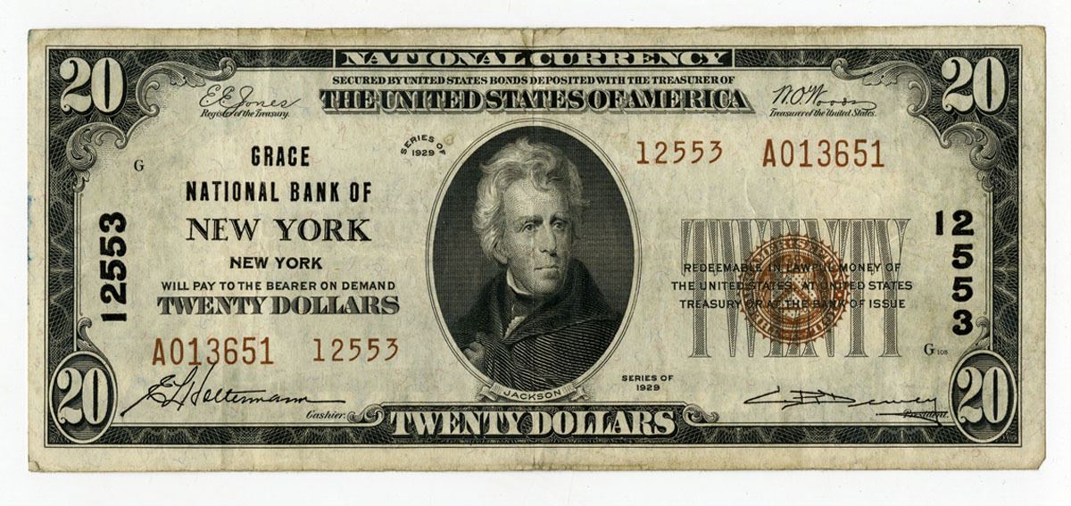 New York, Series of 1929. $20 Type 2, Ch.# 12553, Issued Banknote, Black with brown underprint and portrait of Andrew Jackson at center, Back is green with White House at center, S/N A013651 12553, VF to XF condition.