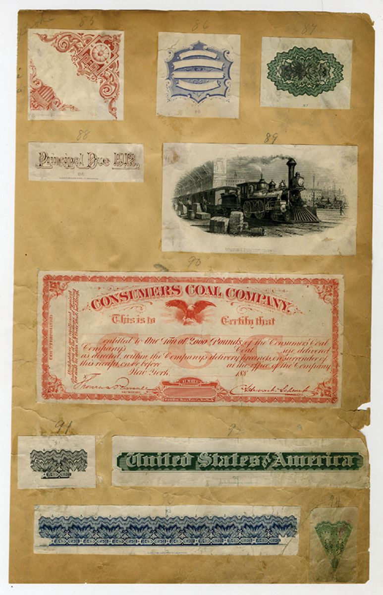 New York, Hamilton BNC., ca.1880s, Sample Vignette Book page with 10 Vignettes, featuring locomotive at station, Consumers Coal Company certificate printed in orange for 1 ton of 2000 Pounds of Consumer Coal Company's coal, and various vignettes used on stocks, bonds, banknotes, fiscal documents and related items. Intaglio printed in various colors. Numbers are drawn in pencil under each images. All are pasted to a light manila paper sheet, 8.5 x 10 inches, VF to AU condition. HBNC.
