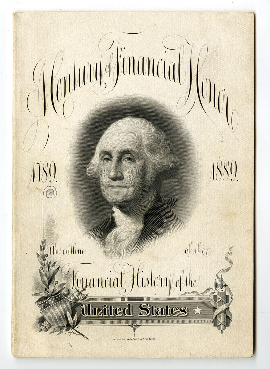 New York, 1889. Octavo sized book by Harvey Fisk & Sons Bankers of the Financial History of the United States of America, 27 pages of text and advertisements, Intaglio printed vignette of George Washington on cover, and Martha Washington and I think Madison flanking a standing allegorical Justice, Choice AU condition with very light handling condition, Printed by ABNC. This is the first time we have handled this item.