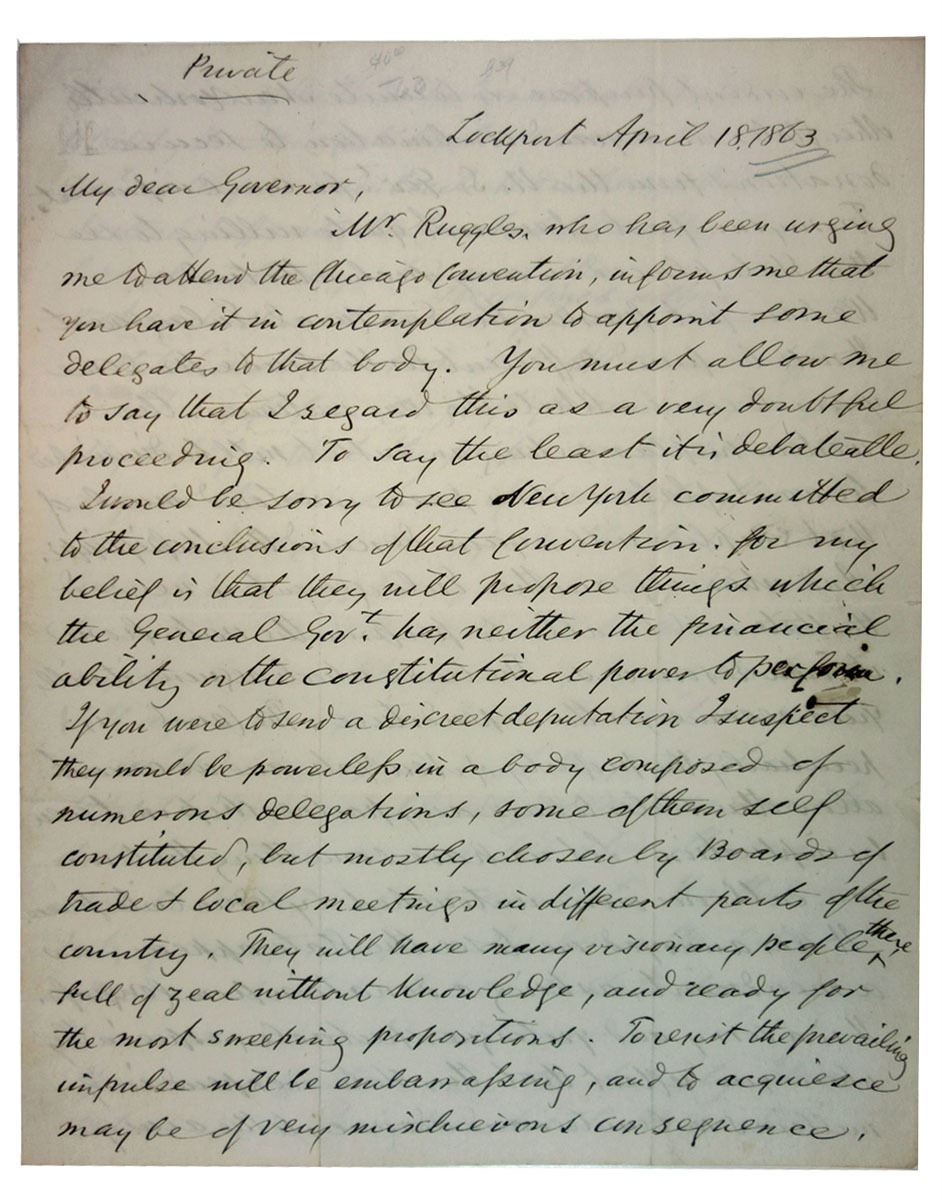 Lockport, New York. April 18, 1863. Letter from Washington Hunt to New York Governor Horatio Seymour, several pages long and in black handwriting. This piece discusses the Chicago Canal Convention of 1863 and the Erie Canal, as well as briefly mentions the ongoing Civil War. Washington Hunt takes a grim view of the Canal Convention, stating that it is his belief that "they will propose things which the General Government has neither the financial ability or the Constitutional power to perform." He continues to write, "We have just finished the Erie Canal enlargement, it will be found sufficient for the trade in some years to come...The Canal is...the property of New York and we cannot allow other states to have any partnership in it even by implication. Let us have something that we can call our own, untouched by Federal interference." This document highlights the different political perspectives between the two politicians, as Hunt admits that he took the liberty to make these suggestions to Governor Seymour. He is particularly concerned about New York State's rights, and ends the letter with a plead to not "reduce the State to a mere satellite of the central government." Washington Hunt (August 5, 1811 - February 2, 1867) was an American lawyer and politician. In his last years, Hunt moved increasingly closer to the Democrats, endorsing his two-time opponent, Horatio Seymour for the New York gubernatorial race in 1862 and supporting George McClellan for the presidency at the 1864 Democratic National Convention. Horatio Seymour (May 31, 1810 - February 12, 1886) was an American politician. He served as Governor of New York from 1853 to 1854 and from 1863 to 1864. He was the Democratic Party nominee for president in the 1868 presidential election, won by Republican, General Ulysses S. Grant. Fascinating piece of history related to two political figures and New York Governors who opposed each other in elections more than once, but clearly had a communicative relationship. Rare and unique document.