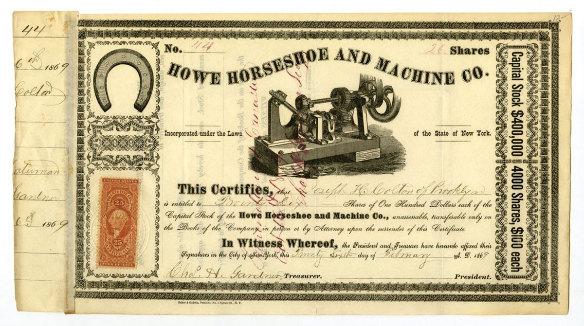 New York, New York, 1869. 26 Shares Capital Stock I/C Certificate, Black print with black border, Machine depicted at top center below company title with horseshoe at top left corner, 25 Cent revenue stamp at bottom left, S/N 114, Cancelled in red ink, Fine to VF+ condition. Baker & Godwin, Printers, NY.