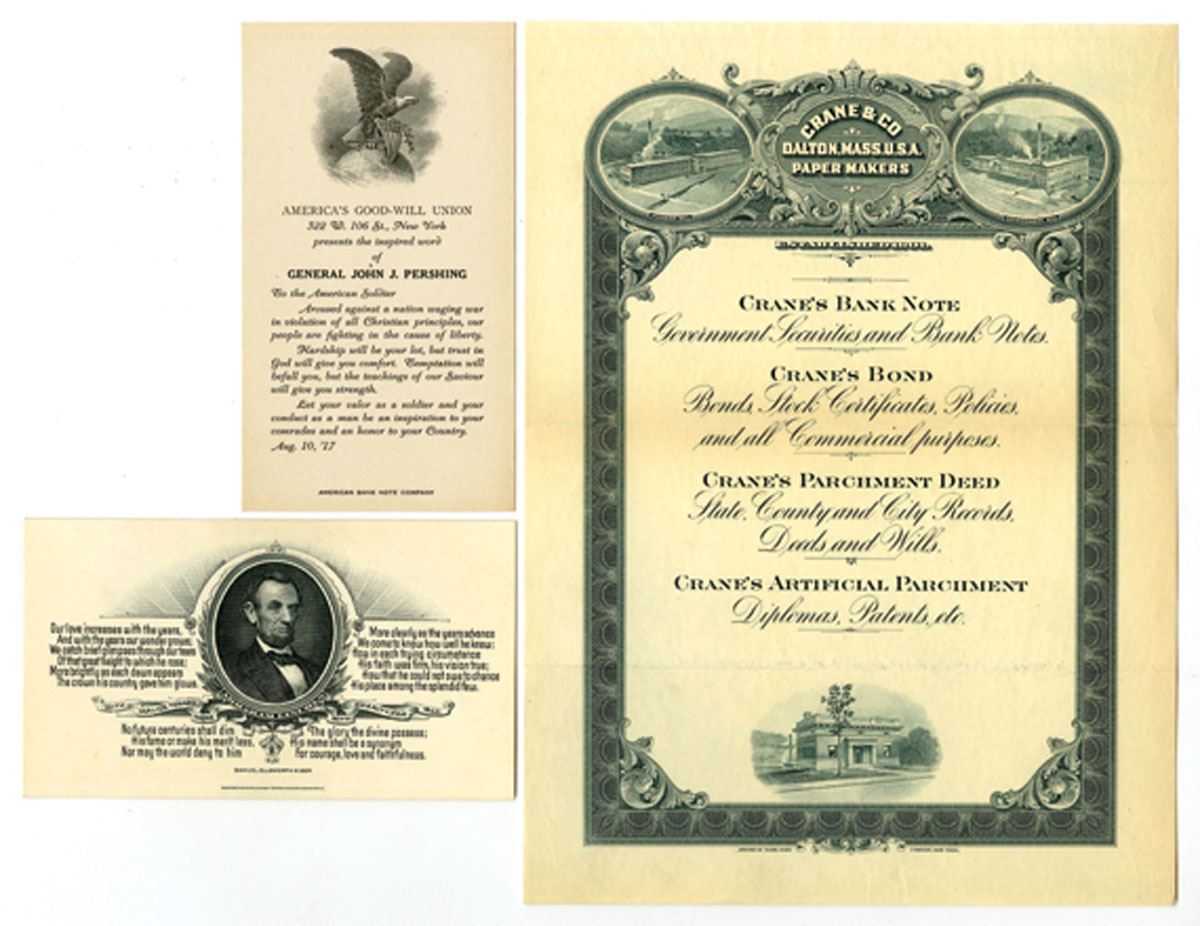 New York, NY, and Chicago, Illinois. Lot of 3 Engraved items, Includes ca.1920, Crane & Co. Paper Makers intaglio printed Advertisement by ABNC, they are the security paper makers for the U.S. currency,; NY. "America's Good-Will Union" Advertisement Card printed by ABNC; and, Chicago, IL., Western BNC, Abraham Lincoln Memorial advertising card printed by WBNC. All are in AU to uncirculated condition. (3). Sold "AS IS" no returns accepted.