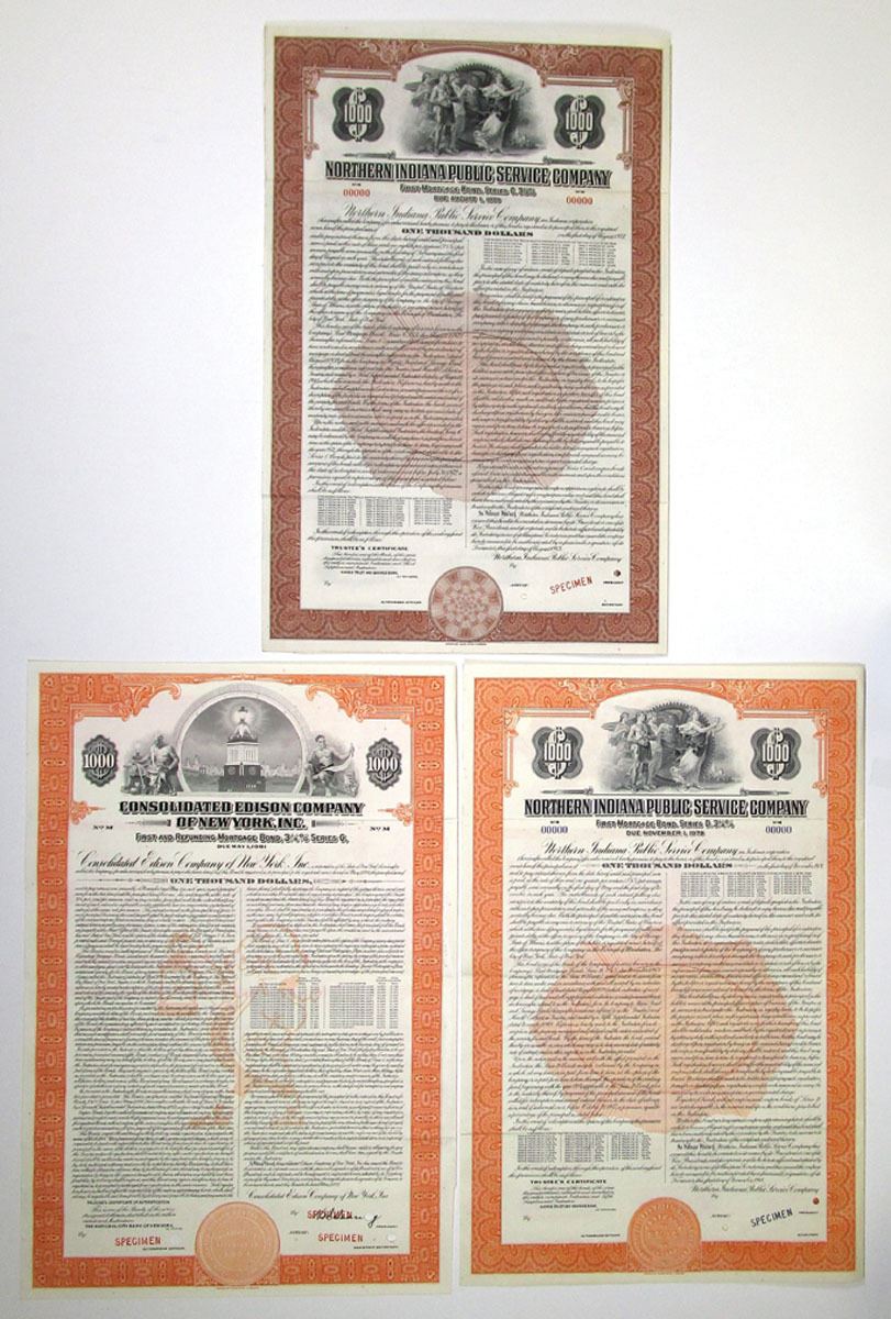 New York & Indiana. Lot of 3 Bonds, including: Northern Indian Public Service Co., 1943 $1000 Specimen 3 1/8% First Mortgage Coupon Bond, Series C, in brown; Northern Indiana Public Service Co., 1948 $1000 Specimen 3.25% First Mortgage Coupon Bond, Series D, in orange; and Consolidated Edison Co. of New York, Inc. 1976 $1000 Specimen 3.25% First and Refunding Mortgage Coupon Bond in orange. All have specimen overprints, 00000 serial numbers, and POCs. VF-XF condition, ABNC. (3)