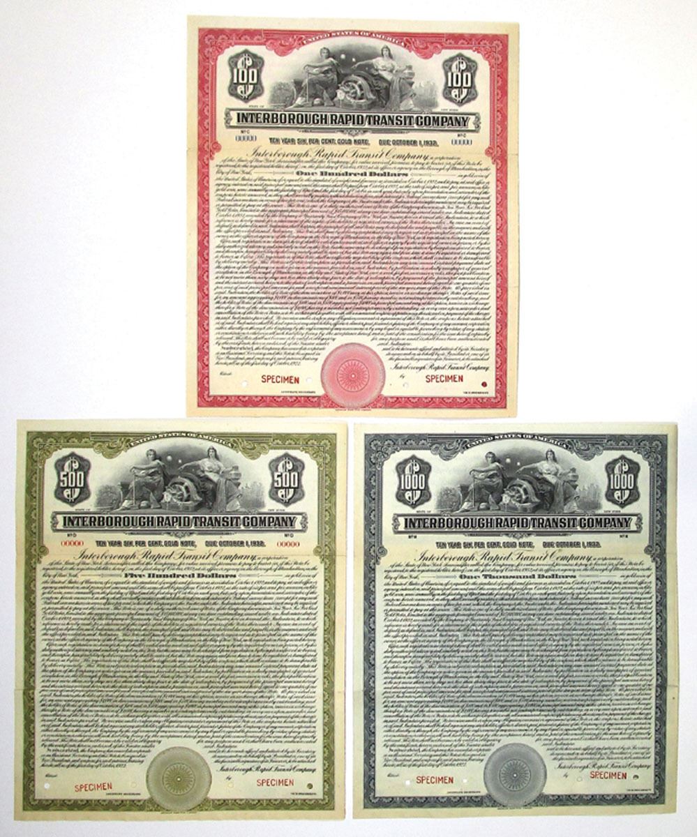 New York, 1922. Lot of 3 Specimen Bonds, all are 6% Ten Year Gold Coupon Bonds with Specimen overprints and POCs, the $100 has red border, $500 has olive green border, and $1000 has blue border, Bonds are in VF to XF conditions printed by ABNC. (3). Sold "AS IS" no returns accepted.