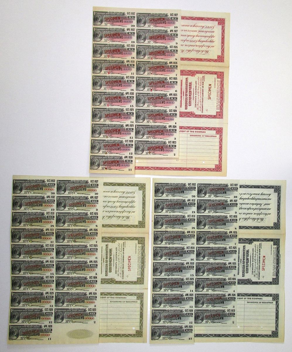 New York, 1922. Lot of 3 Specimen Bonds, all are 6% Ten Year Gold Coupon Bonds with Specimen overprints and POCs, the $100 has red border, $500 has olive green border, and $1000 has blue border, Bonds are in VF to XF conditions printed by ABNC. (3). Sold "AS IS" no returns accepted.