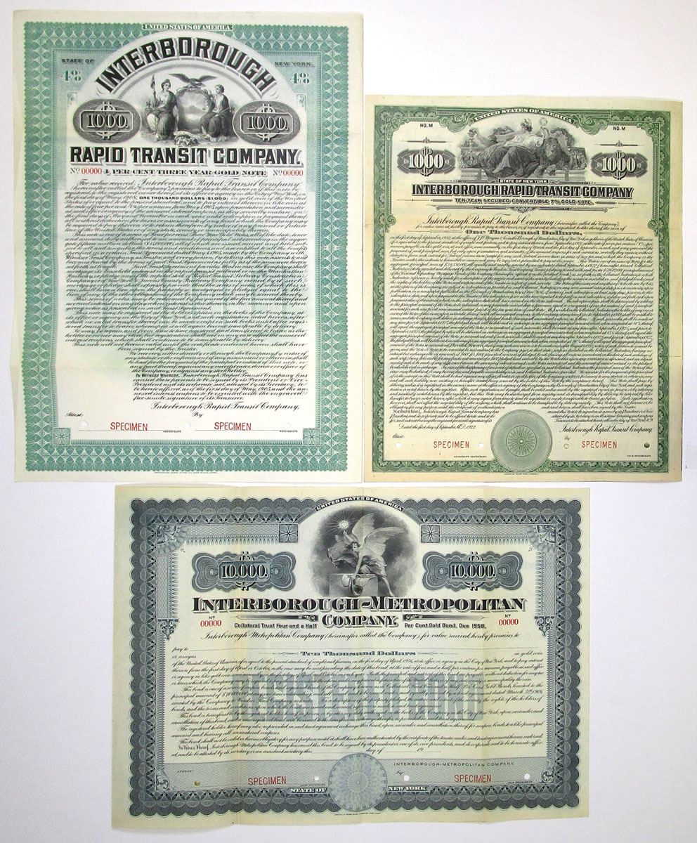 New York, 1905 to 1922 Specimen Railroad Bond Trio, Includes: NY, 1907, Interborough-Metropolitan Co. $10,000, 4 1/2% Registered Collateral Trust Gold Bond, Black with steel blue border; NY, 1905, Interborough Rapid Transit Co. $1000, 4% Gold Coupon Bond, Black with green border and 1905, $1000 7% Secured Convertible Coupon Bond, Black with green border. All have Specimen overprints, POCs, printed by ABNC. Conditions range from VF to XF condition. (3). Sold "AS IS" no returns accepted.