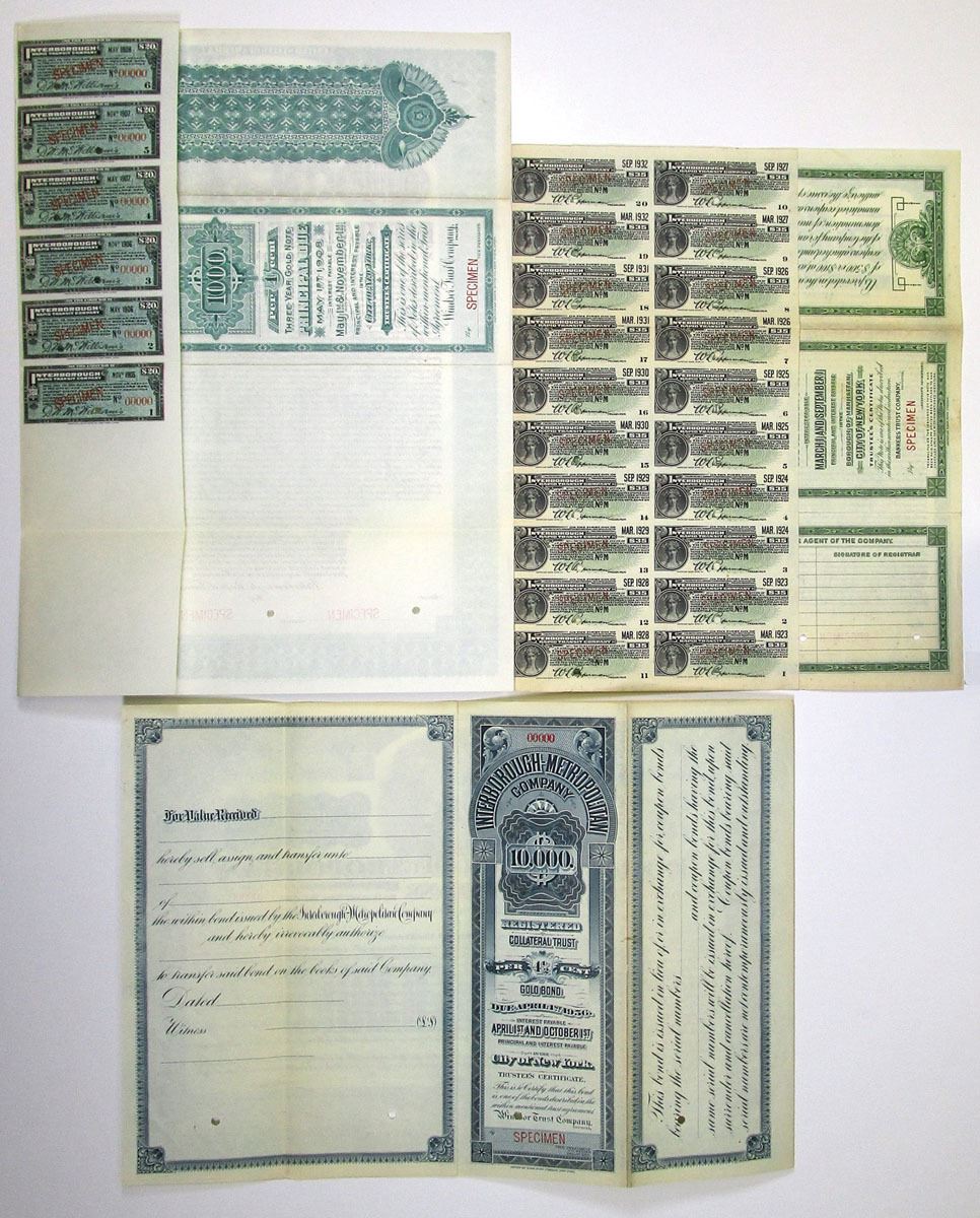 New York, 1905 to 1922 Specimen Railroad Bond Trio, Includes: NY, 1907, Interborough-Metropolitan Co. $10,000, 4 1/2% Registered Collateral Trust Gold Bond, Black with steel blue border; NY, 1905, Interborough Rapid Transit Co. $1000, 4% Gold Coupon Bond, Black with green border and 1905, $1000 7% Secured Convertible Coupon Bond, Black with green border. All have Specimen overprints, POCs, printed by ABNC. Conditions range from VF to XF condition. (3). Sold "AS IS" no returns accepted.