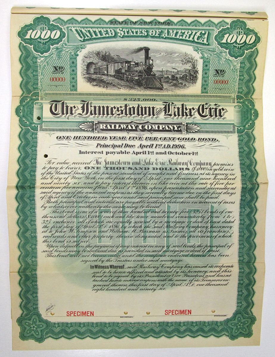 New York, 1896. $1000 Specimen 5% One Hundred Year Gold Coupon Bond, Black with ornate green border and underprint, Train exiting tunnel at top above title, Specimen overprints and POCs, Fine to VF condition with minor archival reinforcement at fold lines, ABNC. Only known as a specimen in Cox, no issued examples known.