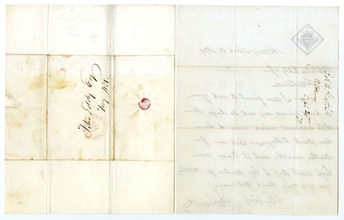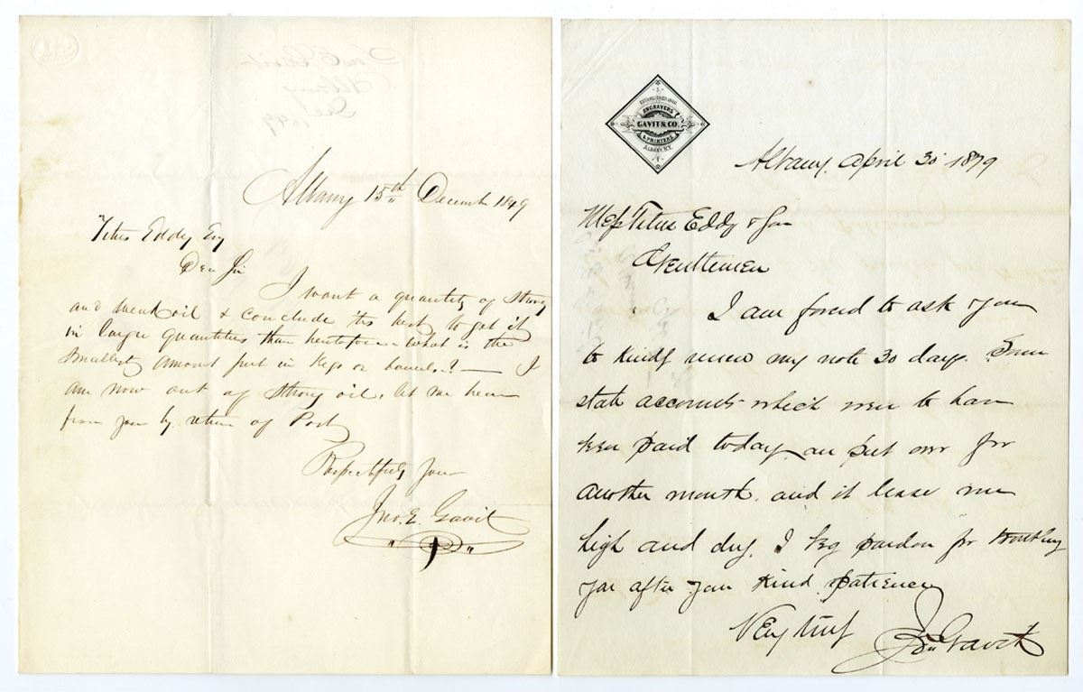 Albany, New York, 1849 & 1879. Lot of 2 letters regarding orders from printing houses. The 1849 Stampless letter to Titus Eddy, Esq, requesting oil for printing, written and signed by John Gavit;; and, the second, on a Gavit Letterhead, also to Titus, hand written by Gavit requesting payment, both letters are in VF to XF condition. (2).