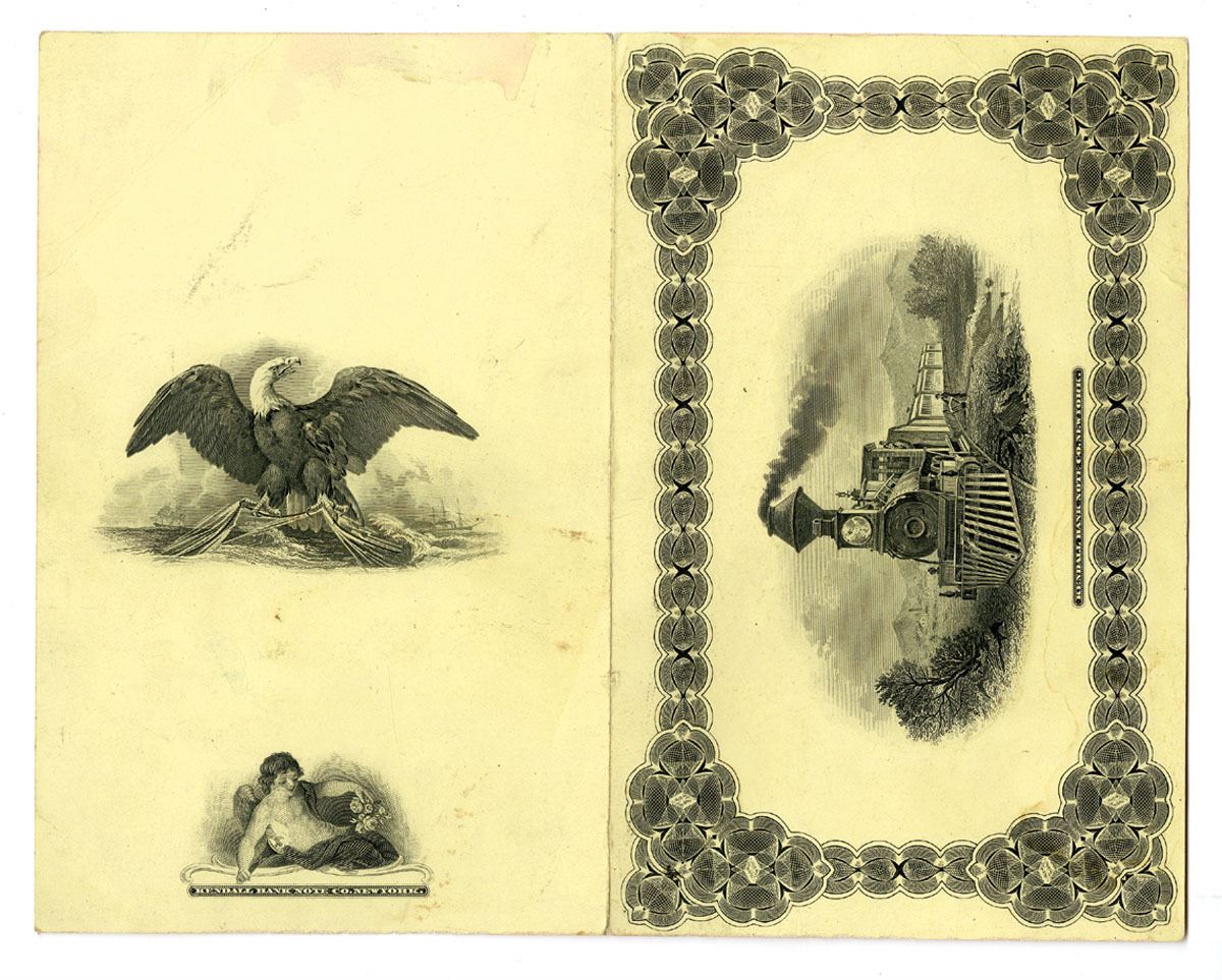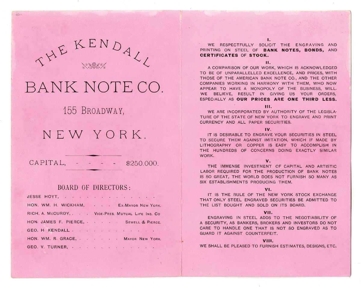 New York, NY. ND (ca.1880s), 2 page advertising booklet with intaglio printed outer layer in black with light glossy yellow paper, interior 2 pages is printed in black on light pink paper with a list of officers and descriptions of what the company prints as well as a solicitation for work, 9 inches x 7.25 inches, Choice VF or better, Rare and first time offered by our firm. Kendall Bank Note Company, NY.