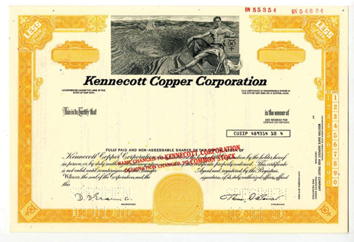 NY. Kennecott Copper Corp, 1980 <100 Shrs Specimen Stock Cert, Unc. SCBN Yellow. In 1915, in order to both dilute the cost of a new railroad for Alaska's copper mines and to find new ventures for the capital produced by the mine, Kennecott Copper Corporation was incorporated out of the various financial interests involved, with Stephen Birch as President. By 1952, Kennecott was easily the biggest copper producer in the United States, accounting for about 25% of copper production in the free world. Following troubles in the 1970s, the company was divided into separate entities, and officially ceased to exist by 1997.