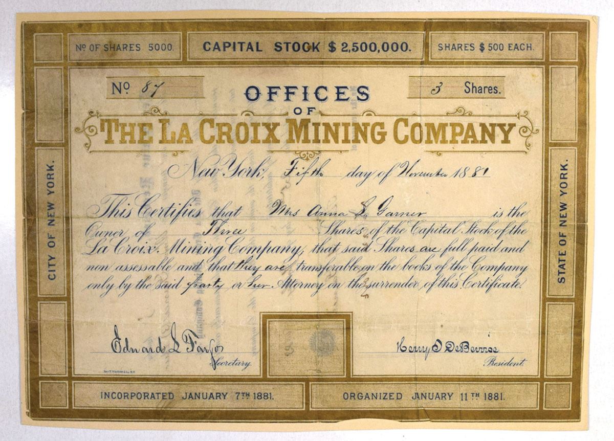 New York. (Location is not specified, but probably a Western mine). 3 Shares I/U Capital Stock Certificate, Blue printing on a gold metallic border and title under, Company title at top, VF condition with light staining and toning, Monted on a thin manila card board, Geo F. Nesbitt.