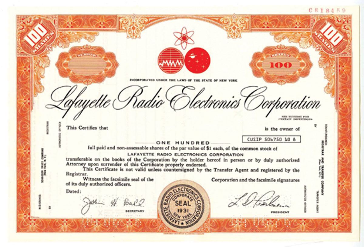 NY. Lafayette Radio Electronics Corp., 1976 100 Shrs Specimen Stock Cert., XF. Lafayette Radio Electronics Corporation was an American radio and electronics manufacturer and retailer from approximately 1931 to 1981. "Wholesale Radio Service" was established in the early 1920s by Abraham Pletman in New York City. Headquartered in Syosset, New York, the company sold radio sets, amateur radio equipment, citizen's band (CB) radios and communications equipment, electronic components and tools through retail outlets and by mail-order.