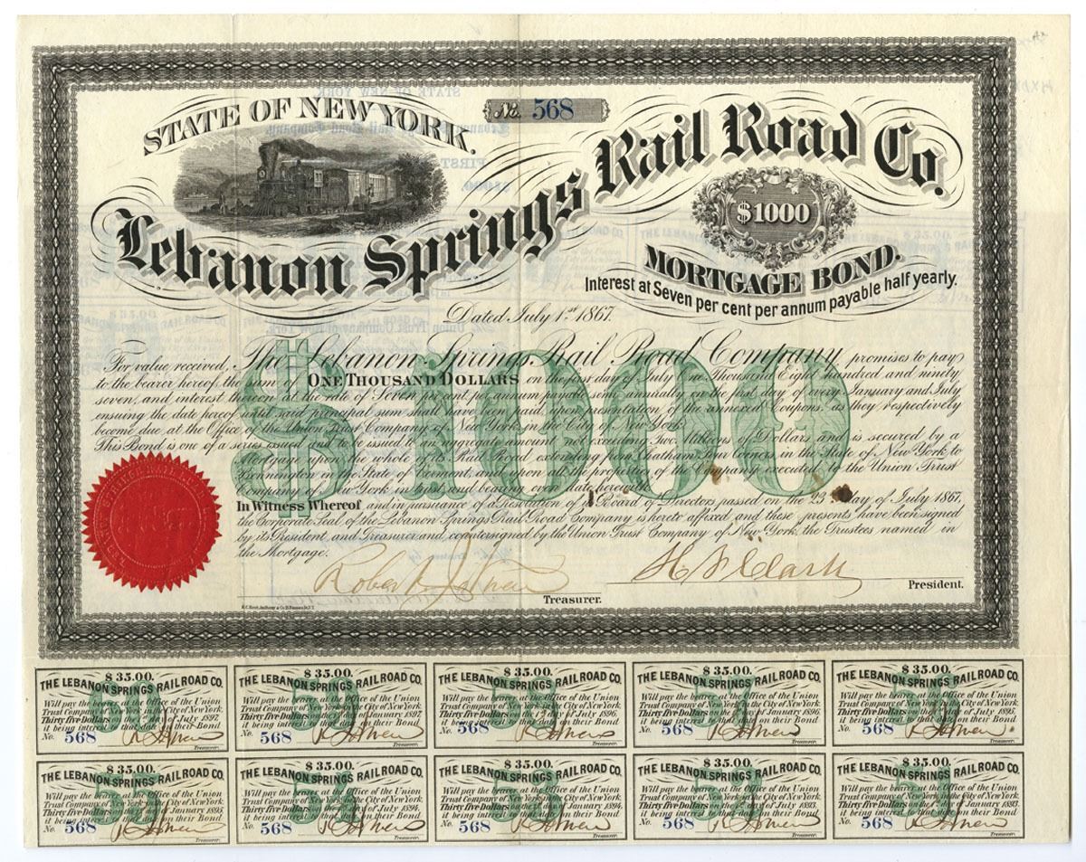 New York, 1867. $1000 I/U 7% Mortgage Coupon Bond, Black text with black border and green underprint, Train passing through countryside at top left corner. Fine-VF condition. Signed by Horace F. Clark as president. Horace Francis Clark (November 29, 1815 – June 19, 1873) was a railroad executive and U.S. Representative from New York. He also married Cornelius Vanderbilt's daughter, Maria Louisa Vanderbilt.