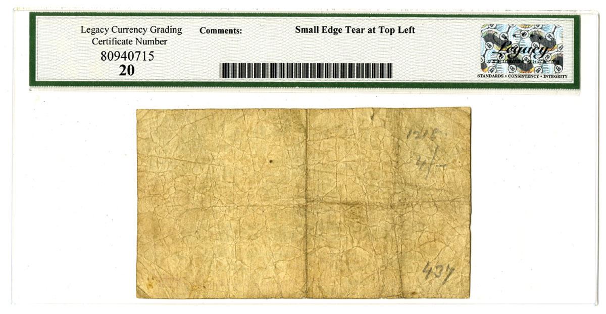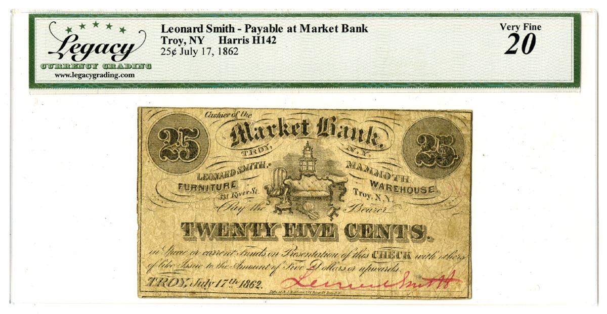 Troy, New York, July 17, 1862. 25 Cents, Harris H142, I/U Banknote, Black print with title at left and right of ornate furniture, Uniface note, Certificate is payable at Market Bank, Signed by Lenoard Smith with red pen at bottom, Legacy graded Very Fine 20 with comment "Small Edge Tear at Top Left."