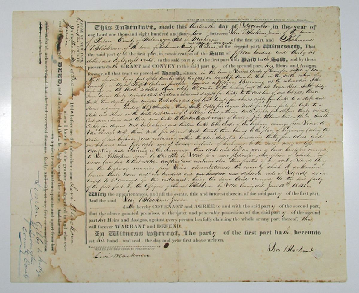 Livonia, Livingston County, New York, 1842. Issued Land Deed Between Levi Blackmer, Junior and Richmond Blackmer, with a plot of land, Lot Number 42, being transferred for the sum of $1536.88. Black text with black handwriting that outlines and describes the plot's location. Signed by Levi Blackmer at bottom. The Blackmer family were early settlers of the area of Livingston County (once Ontario County) in New York State. Fine condition with large stain at left, foxing, and signs of wear along fold lines. Rare piece of New York State history.