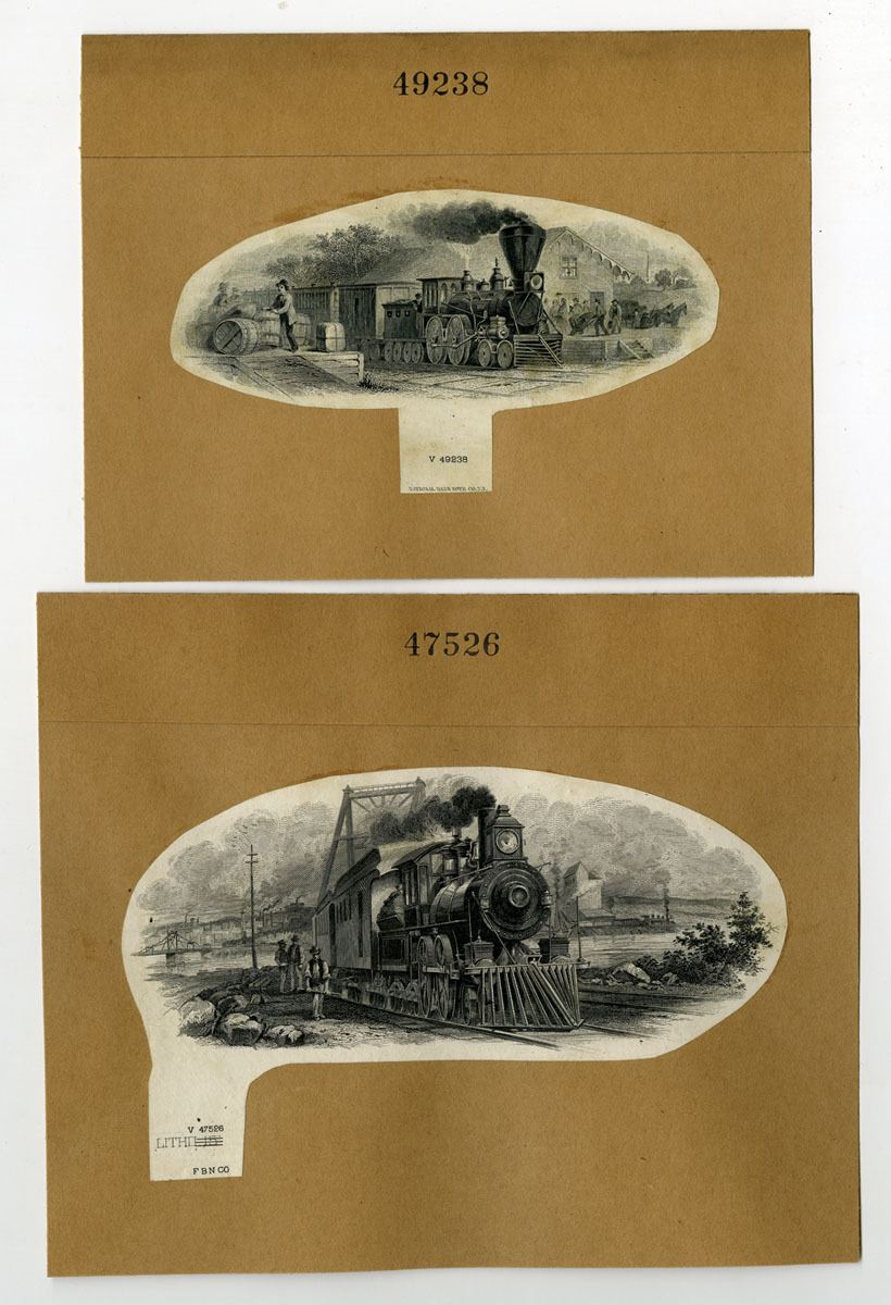 New York, ca.1870-1890s. Lot of 2 Railroad vignettes, includes: Franklin BNC Intaglio PROOF with Train Facing w/3 Men Standing, Vignette No. 47526, 6 x 5 inches; National BNC, Proof Vignette of "Train Departing Station Stop" 1860-80s, Intaglio, CU Black, 5.5 x 4.5 inches. Both are printed on india paper mounted on cardstock, they were used on stock and bond certificates and fiscal documents, Condition ranges from XF to uncirculated condition. (2). Sold "AS IS" no returns accepted.