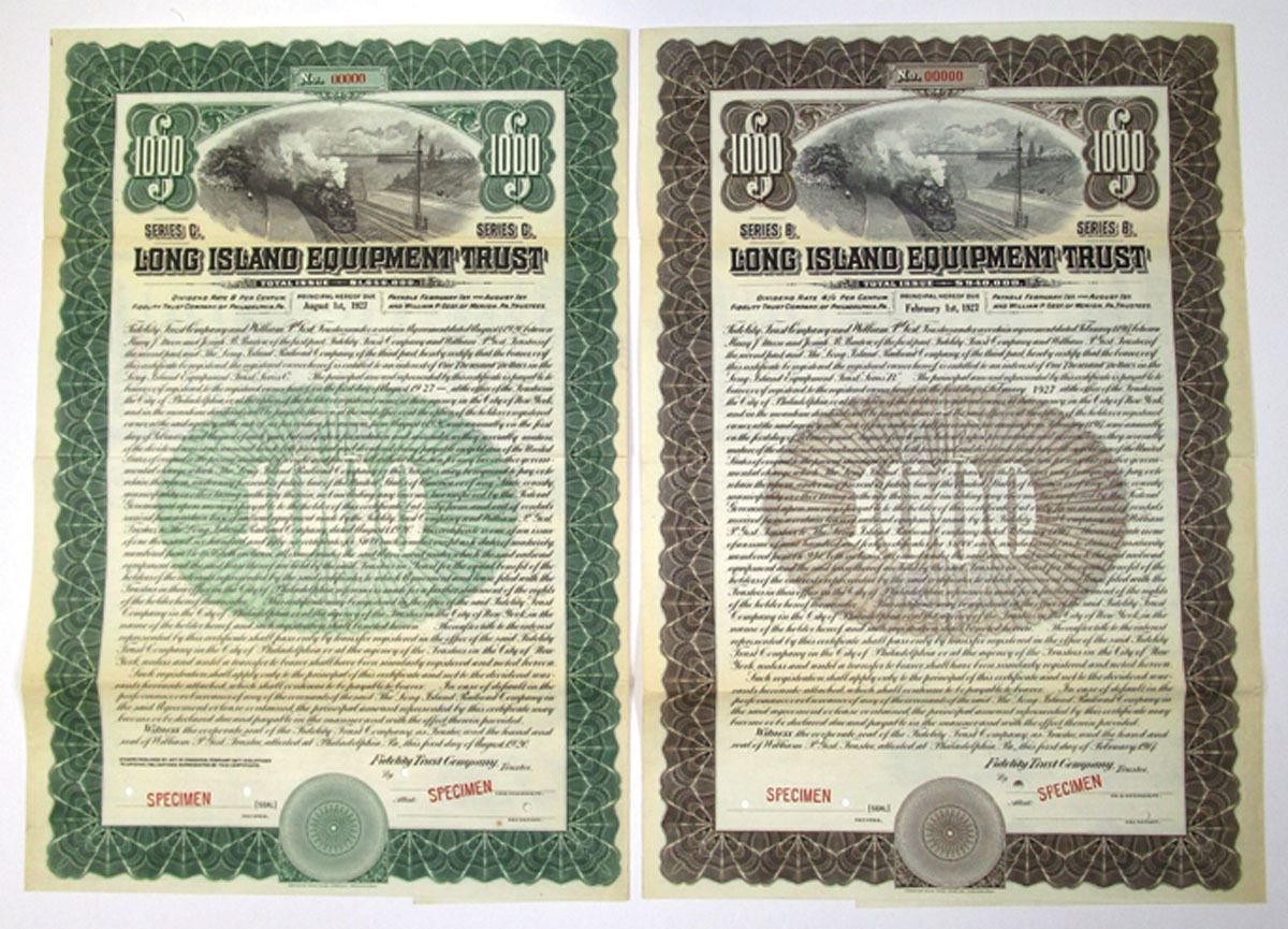 New York, 1917 and 1920 Lot of 2 Specimen Bonds, Includes: 1917 $1000 4 1/2% Series B Coupon Bond, Black with brown border; 1920, $1000 6% Series C Coupon bond, Black with green border, Both have same vignette of train rounding a bend at top above title, Specimen overprints, POCs, are in VF to XF condition, and printed by Franklin Lee ABNC. Attractive railroad bond pair.