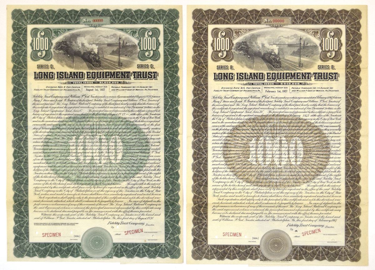New York, 1917 and 1920 Lot of 2 Specimen Bonds, Includes: 1917 $1000 4 1/2% Series B Coupon Bond, Black with brown border; 1920, $1000 6% Series C Coupon bond, Black with green border, Both have same vignette of train rounding a bend at top above title, Specimen overprints, POCs, are in VF to XF condition, and printed by Franklin Lee ABNC. Attractive railroad bond pair.