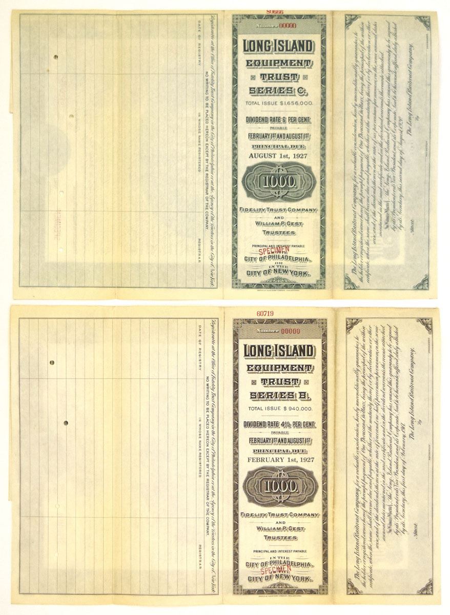 New York, 1917 and 1920 Lot of 2 Specimen Bonds, Includes: 1917 $1000 4 1/2% Series B Coupon Bond, Black with brown border; 1920, $1000 6% Series C Coupon bond, Black with green border, Both have same vignette of train rounding a bend at top above title, Specimen overprints, POCs, are in VF to XF condition, and printed by Franklin Lee ABNC. Attractive railroad bond pair.