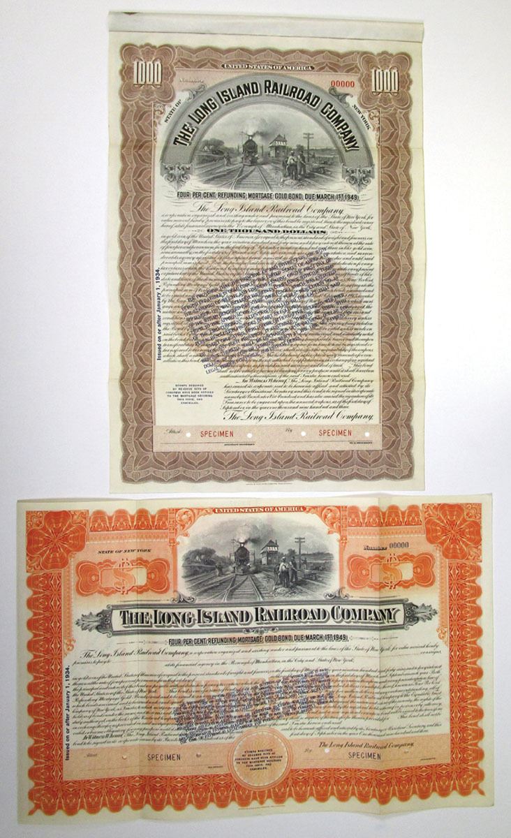 New York, 1903 (Reissued in 1934) Lot of 2 Specimen Bonds, Includes: $-Odd Registered 4% Refunding Mortgage Bond, Black printing with orange border; and, $1000 4% Refunding Mortgage Coupon Bond, Black printing with brown border, both are overprinted Gold Bonds that were reissued on the original form but now payable in any Coin or Currency that is Legal Tender at time of payment, Specimen overprints, POCs, are in VF to XF condition, printed by ABNC.