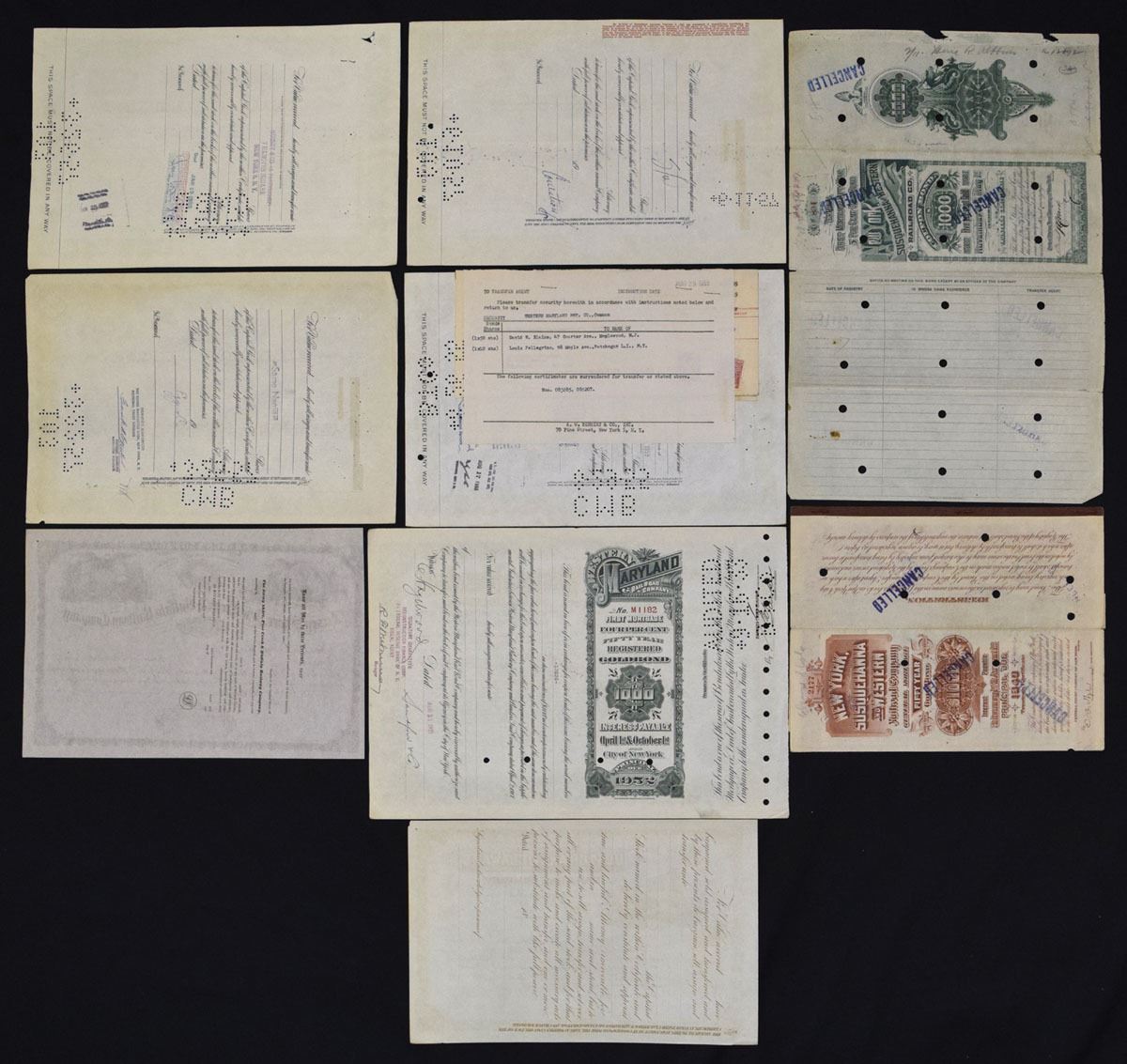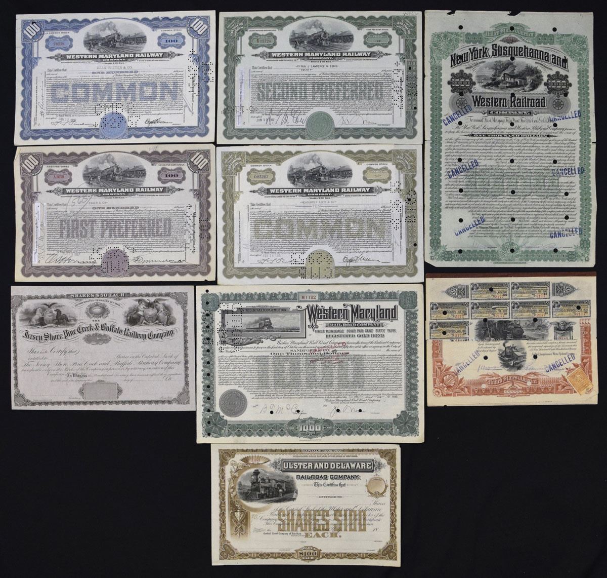 New York, Maryland, New Jersey, ca. 1880s–1950s. Lot of 9 I/C Stock and Bond Certificates, Includes: Western Maryland Railway Co. (4); New York, Susquehanna and Western Railroad Co.; Housatonic and New Canaan Railroad Co.; Western Maryland Railroad Co.; Ulster and Delaware Railroad Co.; Jersey Shore, Pine Creak & Buffalo Railway Co. . Certificates range from VF to EF. (9). Sold “AS IS,” no returns accepted.