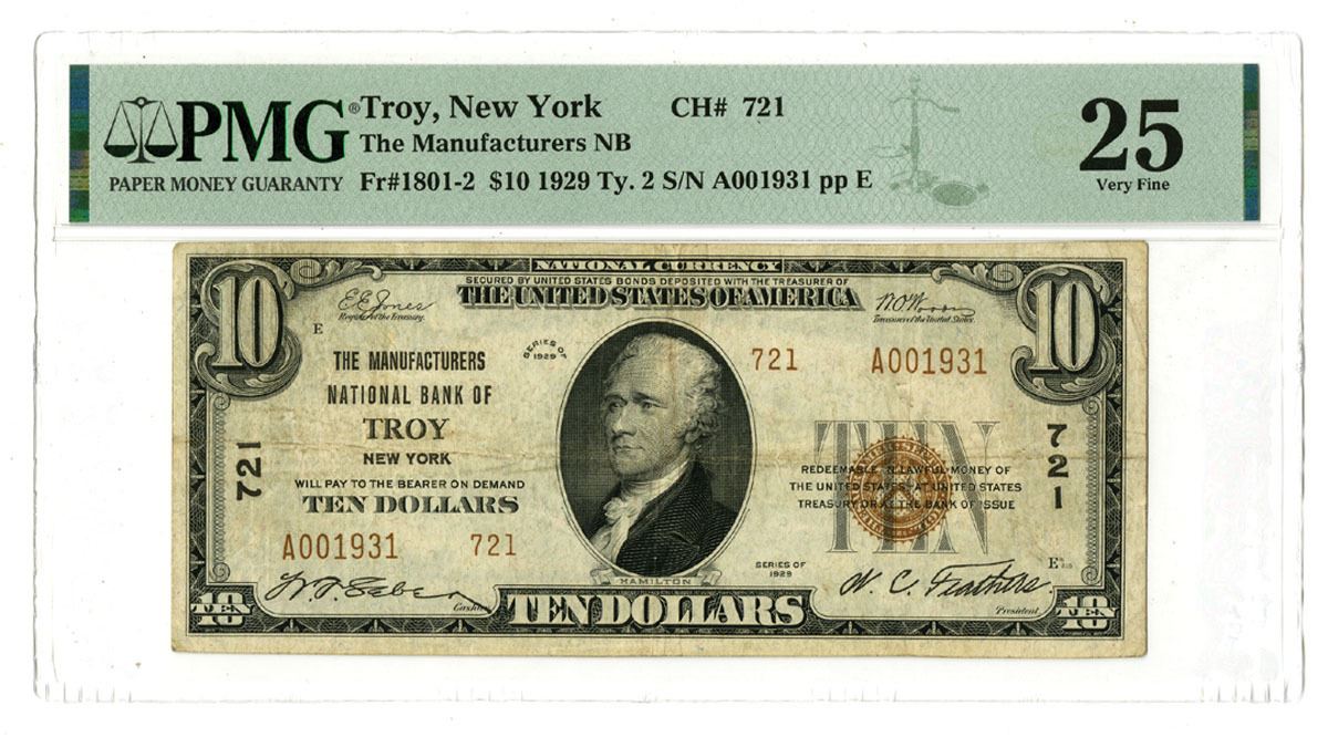 Troy, New York, 1929. $10, Series of 1929, Fr.# 1801-2, Ch#721, Type 2, Issued National Banknote, Brown seal at right, Jones | Woods signatures, S/N A001391 pp E, PMG graded Very Fine 25.