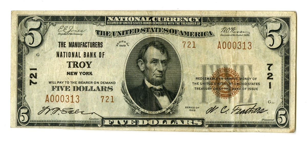 Cohoes, New York, 1929. $5 PB, Series of 1929, Ch# 721, Fr.# 1800-2, Jones | Woods signatures, Brown scalloped seal at right, S/N A000313, VF to XF condition. Only 9 examples for this denomination are found out of 175 total notes recorded on this bank