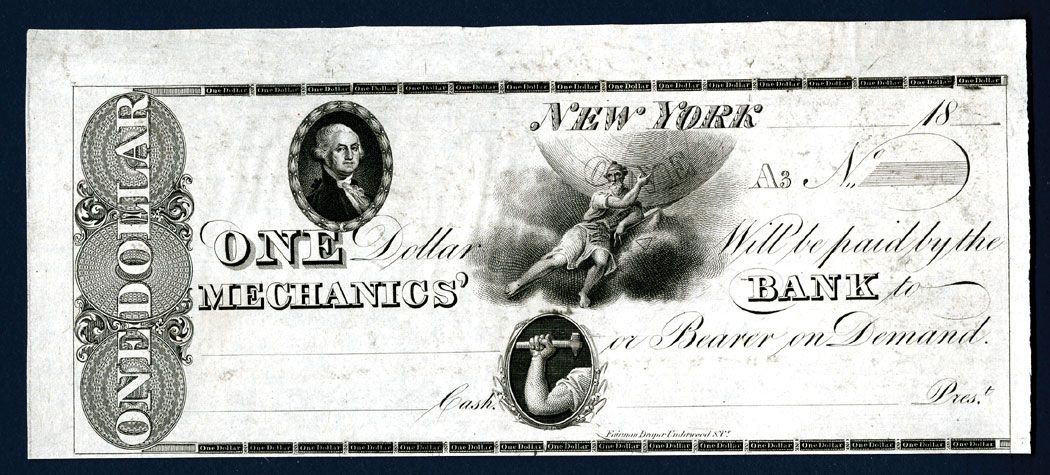 New York, NY. (NY-1720-Unlisted denomination), George Washington on top left, Arm and Hammer on bottom middle and Archimedes Holding up the world in middle, black on thin india paper, large margin on top and left, appears Uncirculated to CU condition. FDU, Rare note. (ex. Smythe, Apr. 12, 2007, Lot 3204, Sold $663)