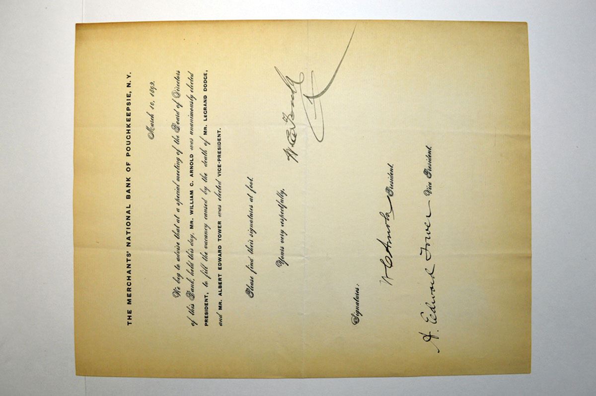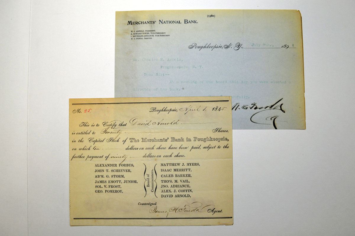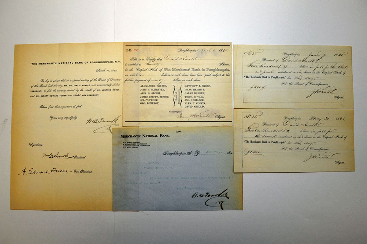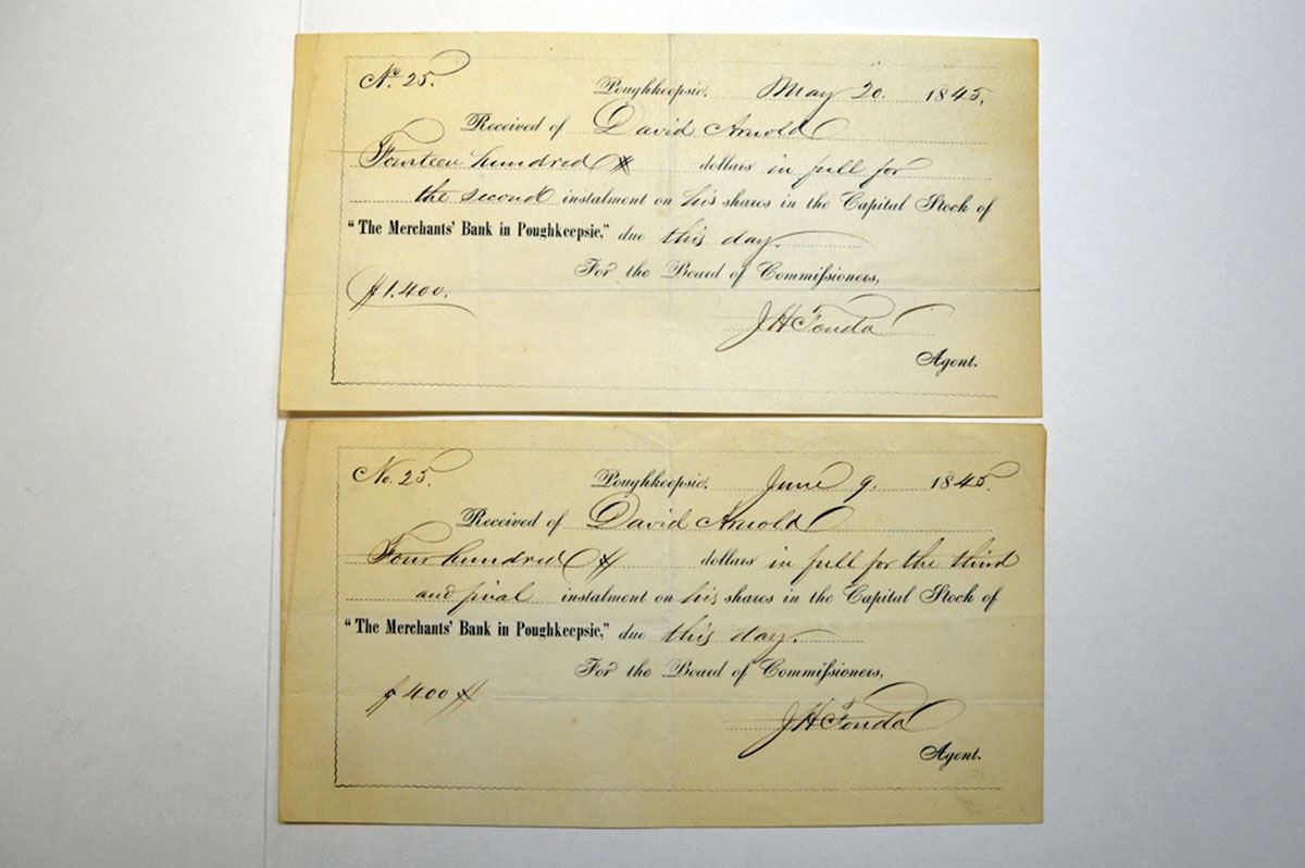 Poughkeepsie, New York. 1845, I/U Stock Subscription Certificate for partial payment of 20 Shares Lot of pay stubs and letters from the Merchant's Bank, and Merchant's National Bank, some referring to the board of directors. All in VF-XF condition.