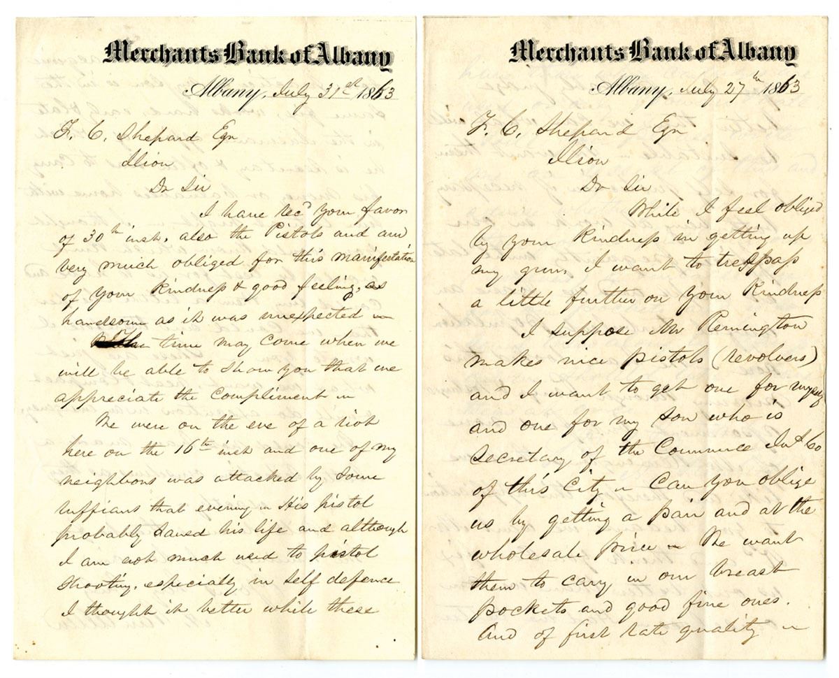 Albany, New York, 1863. Lot of 2 Letters from Mr. A Van Allen, first is dated July 27th, 1863, wanting to purchase a Remington pistol for self protection, he writes "we have an awful turbulent population here," Second letter is dated July 31st, 1863 thanking Mr. Shephard Esq. for sending the pistol - he writes "we were on the eve of a riot here on the 16th and one of my neighbors was attacked by some ruffians the evening and his pistol probably saved his life... these are just what we want, neat, compact and will do execution in an emergency..." Letters are in VF to XF condition. (2). Sold "AS IS" no returns accepted. This request was probably related to the Draft Riots in New York during the Civil War.