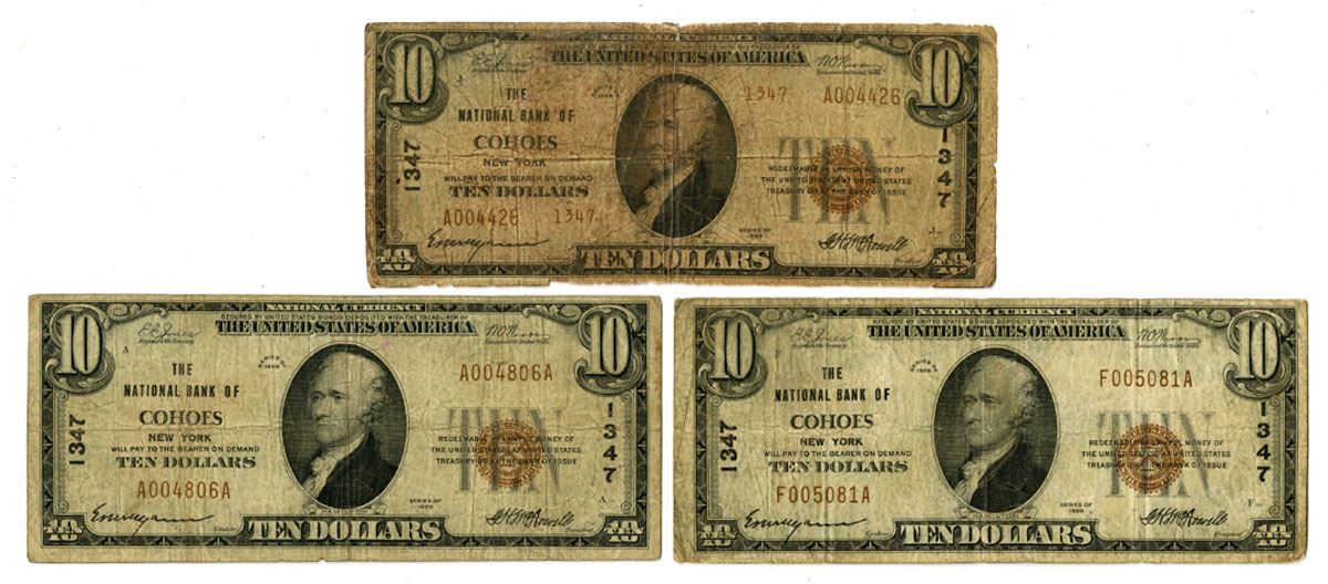 Cohoes, New York, Lot of 3 notes, all are Ch# 1347, Issued National Bank Trio, Includes 1929. $10 T1, Fr.#1801-1 (2), Fine to Choice Fine condition; and, $10 T2, Fr.# 1801-2, Series of 1929, VG with toning and edge faults, All have Brown seal at right and Jones | Woods Signatures, S/Ns A004806A, F005081A, & A004426. (3). Sold "AS IS" no returns accepted.