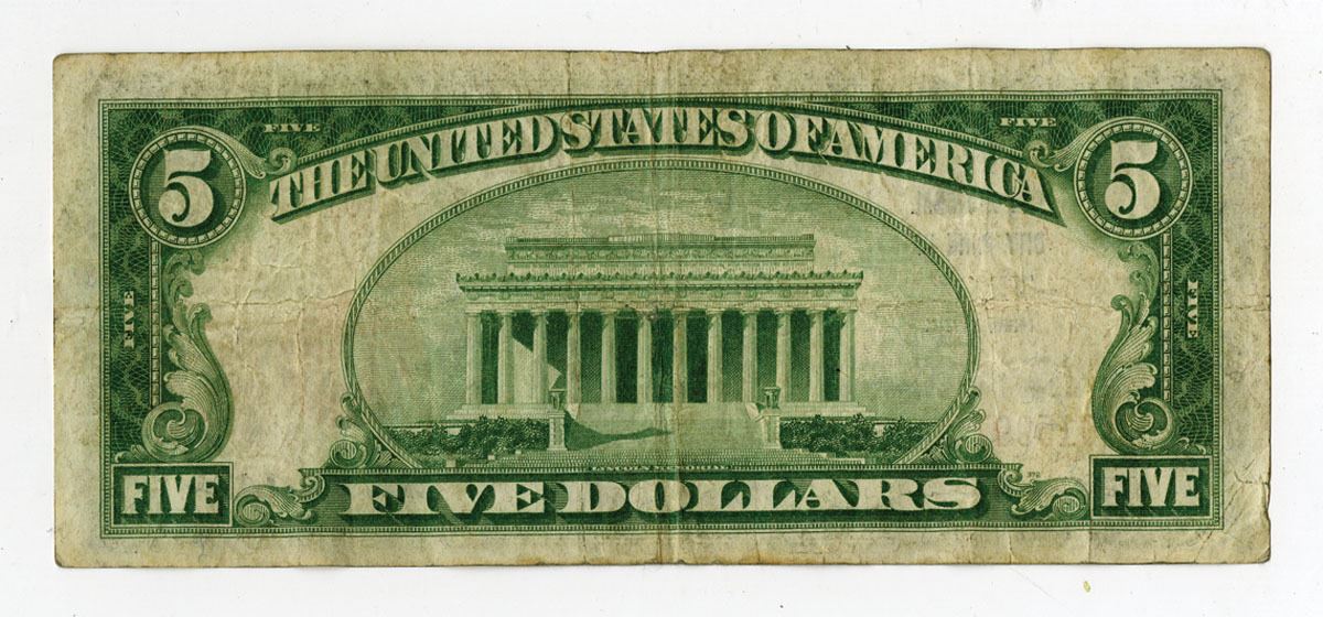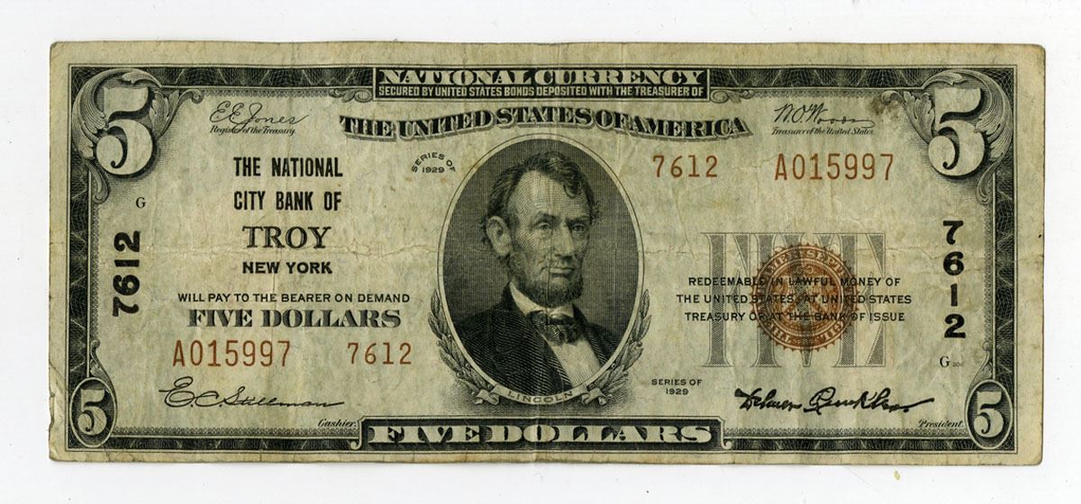 Troy, New York, 1929. $5 T2, Series of 1929, Ch# 7612, Fr.# 1800-2, Jones | Woods Signatures, Small brown seal at right, S/N A015997 pp G206/372, Fine to VF+ condition.