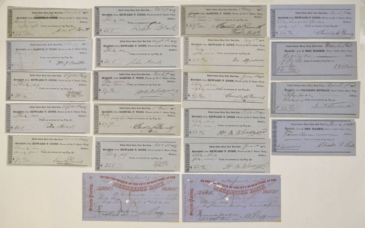 New York, 1849-58. Lot of 21 early New York financial documents, including Treasurer of the City of New York at the Mechanics’ Bank, 1855, pair of I/C checks signed by then-Mayor Fernando Wood, printed in red on blue-violet paper with POCs at center; and United States Navy Yard (Brooklyn Navy Yard), 1849–58, group of 19 issued and unissued military paychecks made out to various sailors. The Navy Yard, established in 1801, was where the famed Civil War ironclad USS Monitor was completed and commissioned and is now known as Greenpoint, Brooklyn, directly across from the midtown-Eastside of Manhattan. Fine to XF condition overall. (21). Sold "AS IS" no returns accepted.