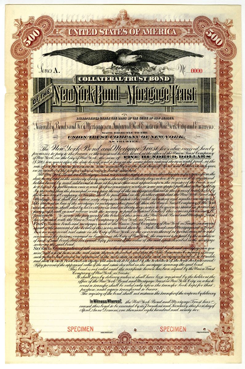 New York (Inc. in New Jersey), 1892, $500, Specimen 6% Mortgage Coupon Bond, Brown border with eagle vignette, POC's, Coupons attached, ABNC, VF-XF.