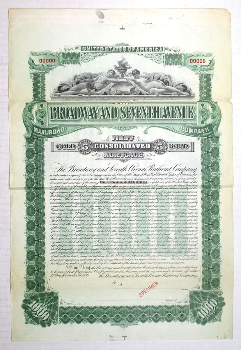 Manhattan, New York, 1893. $1000 Specimen 5% First Consolidated Mortgage Bond, Black with green border and underprint, Bond has extra large margins, Allegorical figures reclining at top, Specimen overprint and POC's, VF condition with ink stains towards bottom and toning, IBNC.