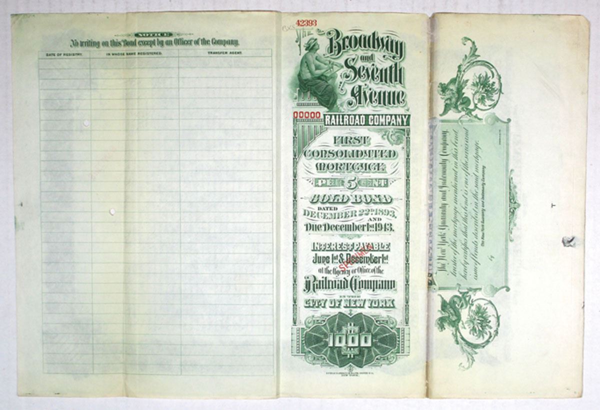 Manhattan, New York, 1893. $1000 Specimen 5% First Consolidated Mortgage Bond, Black with green border and underprint, Bond has extra large margins, Allegorical figures reclining at top, Specimen overprint and POC's, VF condition with ink stains towards bottom and toning, IBNC.
