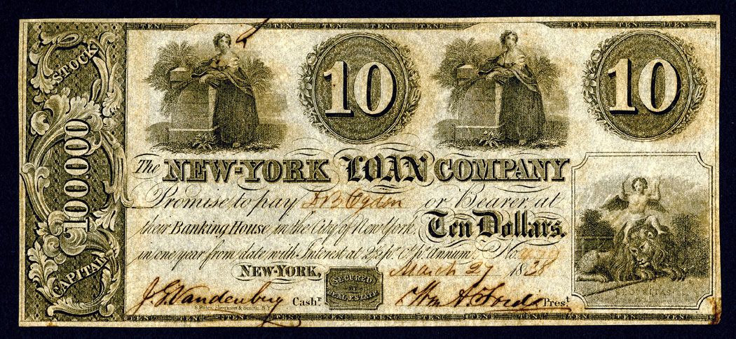 New York, NY. P-Unlisted, Allegorical women flank "10" denomination with cherub on lion lower right, AU.