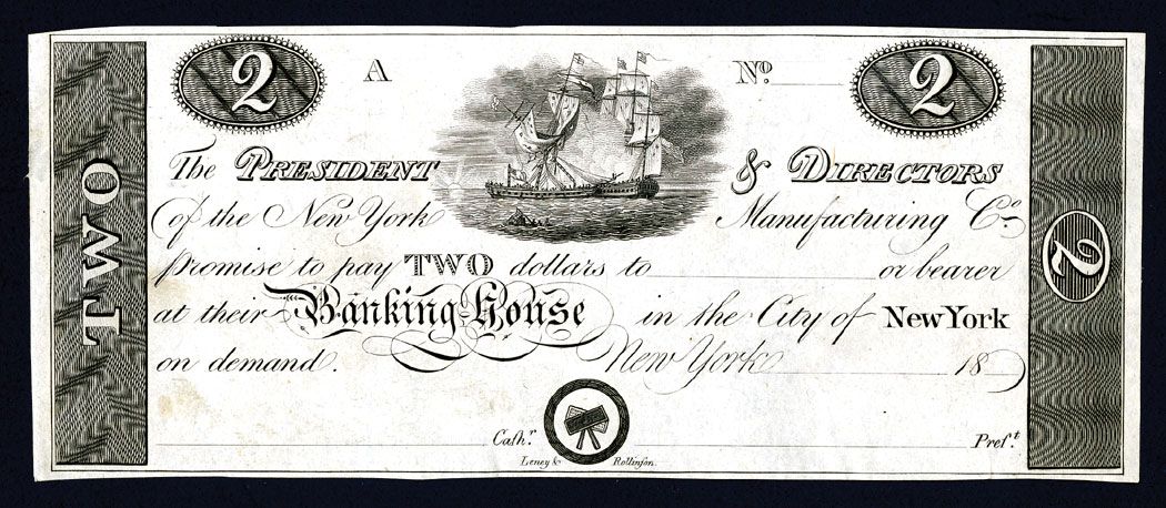 New York, NY. (NY-1825-G14) Proof only issue, Two Sailing ships in combat flanked by "2" counters, black on thin india paper, CU condition with very light mounting evidence on back right border. L&R. (Ex-Stacks "American Sale" January 1999, Lot 740, Sold $1100).