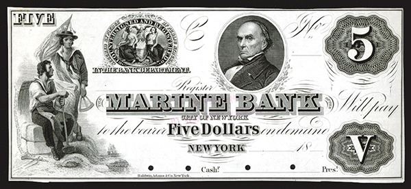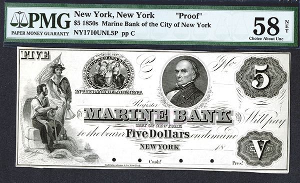 NY-1710. Daniel Webster. Baldwin, Adams. Uncirculated. No folds, but the margins are tight, and there are some tears in the lower right corner.