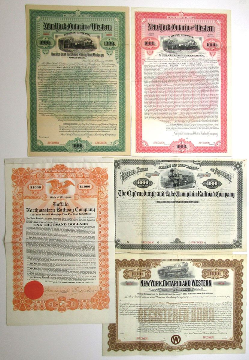 New York, 1888-1917. Lot of 5 Specimen and 1 I/U Bonds, Includes: Buffalo Northwestern Railway Co. $1000 I/U, 1917, Coupon Bond; Ogdensburg and Lake Champlain Railroad Co. $1000 Specimen, 1888, Coupon Bond; New York, Ontario and Western Railway Co. $1000 Specimen, 1899, Coupon Bond; $1000 Specimen, 1904, Coupon Bond; $1000 Specimen, 1905, Registered Bond. Specimens all have Specimen overprints and POCs, and bonds range from Choice Fine to XF condition. (5). Sold "AS IS" no returns accepted.
