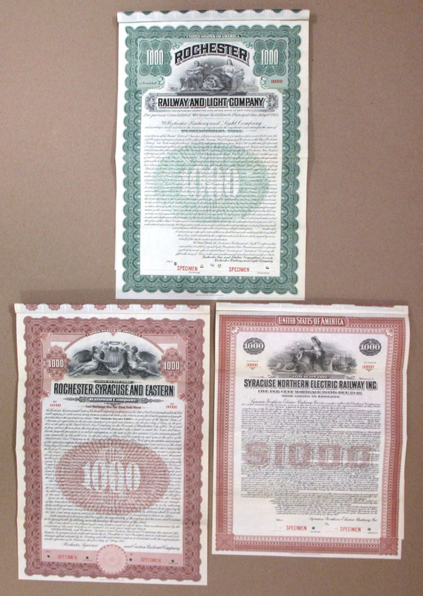 New York, 1904 to 1917. Lot of 3 Specimen Coupon Bonds, Includes: 1904, Rochester Railway and Light Co. $1000 5% Bond; 1905, Rochester, Syracuse and Eastern Railroad Co. $1000 5% Bond; and, 1917, Syracuse Northern Electric Railway Inc. $1000 5% Bond,. All have Specimen overprints and POCs, all are in VF to XF condition, ABNC. (3). Sold "AS IS" no returns accepted.